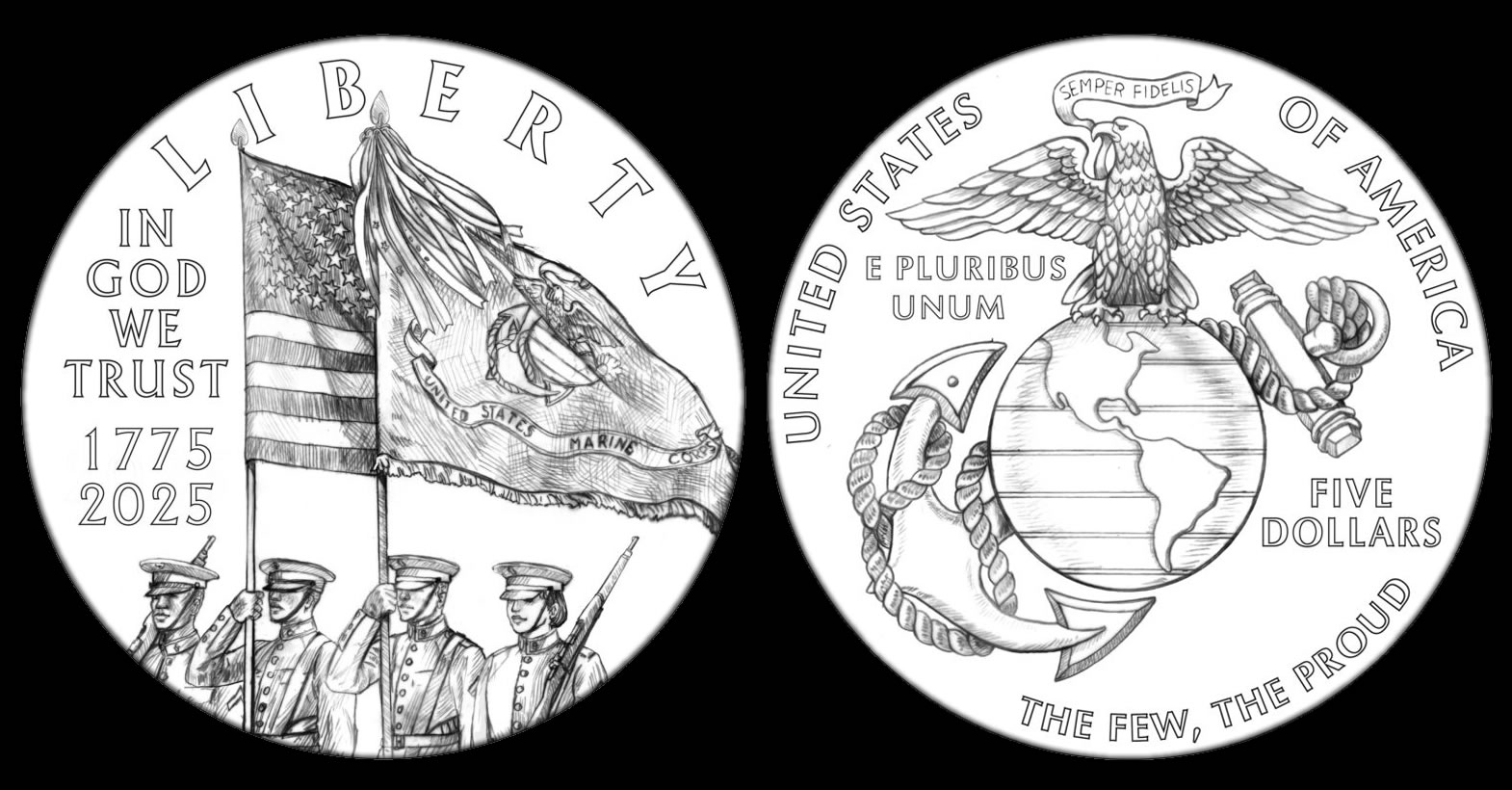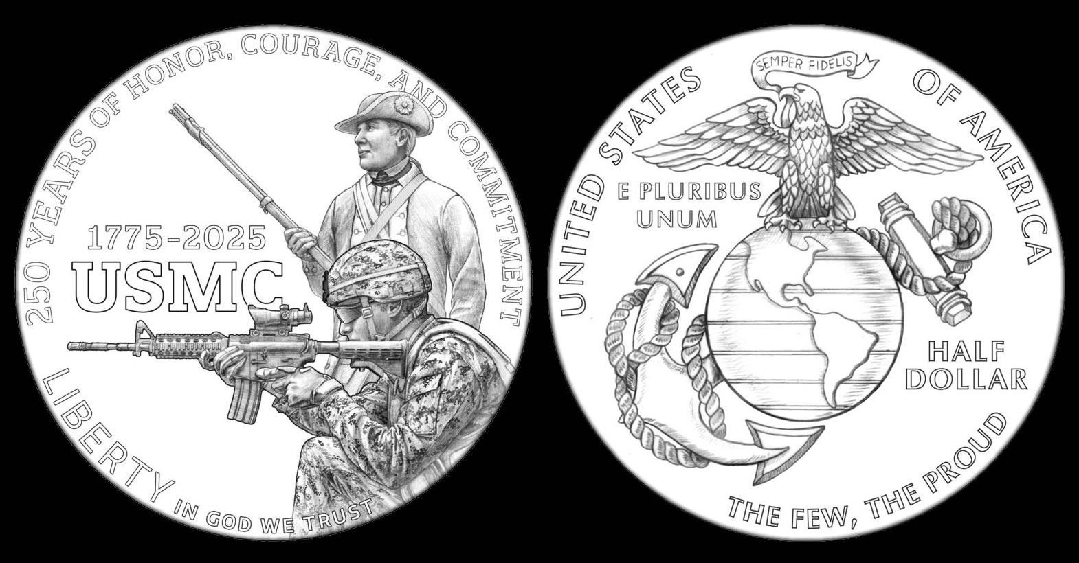 During a ceremony today at the National Museum of the Marine Corps, representatives from the U.S. Mint, USMC, and the Marine Corps Heritage Foundation unveiled the designs for the commemorative coins that will honor the United States Marine Corps’ 250th anniversary, scheduled for release in 2025.
