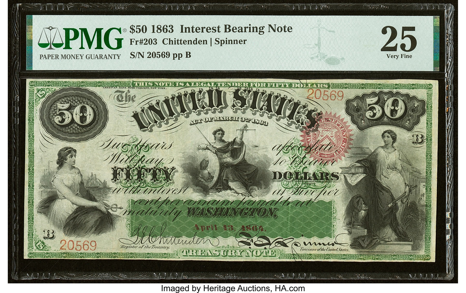 - A Fr. 203 $50 1863 Interest Bearing Note PMG Very Fine 25 – one of just six available to collectors: $120,000