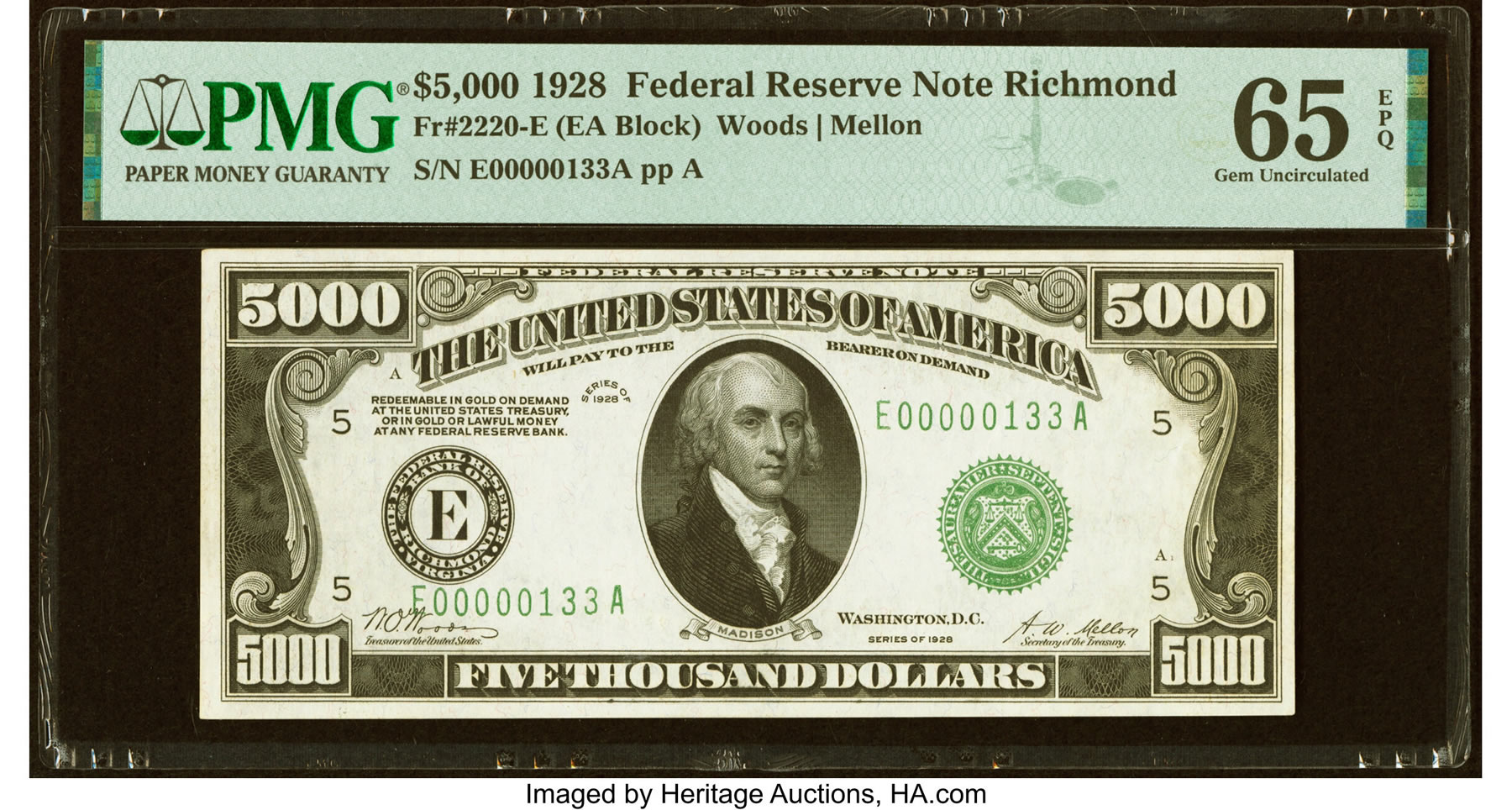 The Fr. 2220-E $5,000 1928 Federal Reserve Note. PMG Gem Uncirculated 65 EPQ that led the currency event comes from the Ronald R. Gustafson Collection, and is the finest PMG-graded Series 1928 in this denomination and the sole finest known 1928 $5,000 from any district.