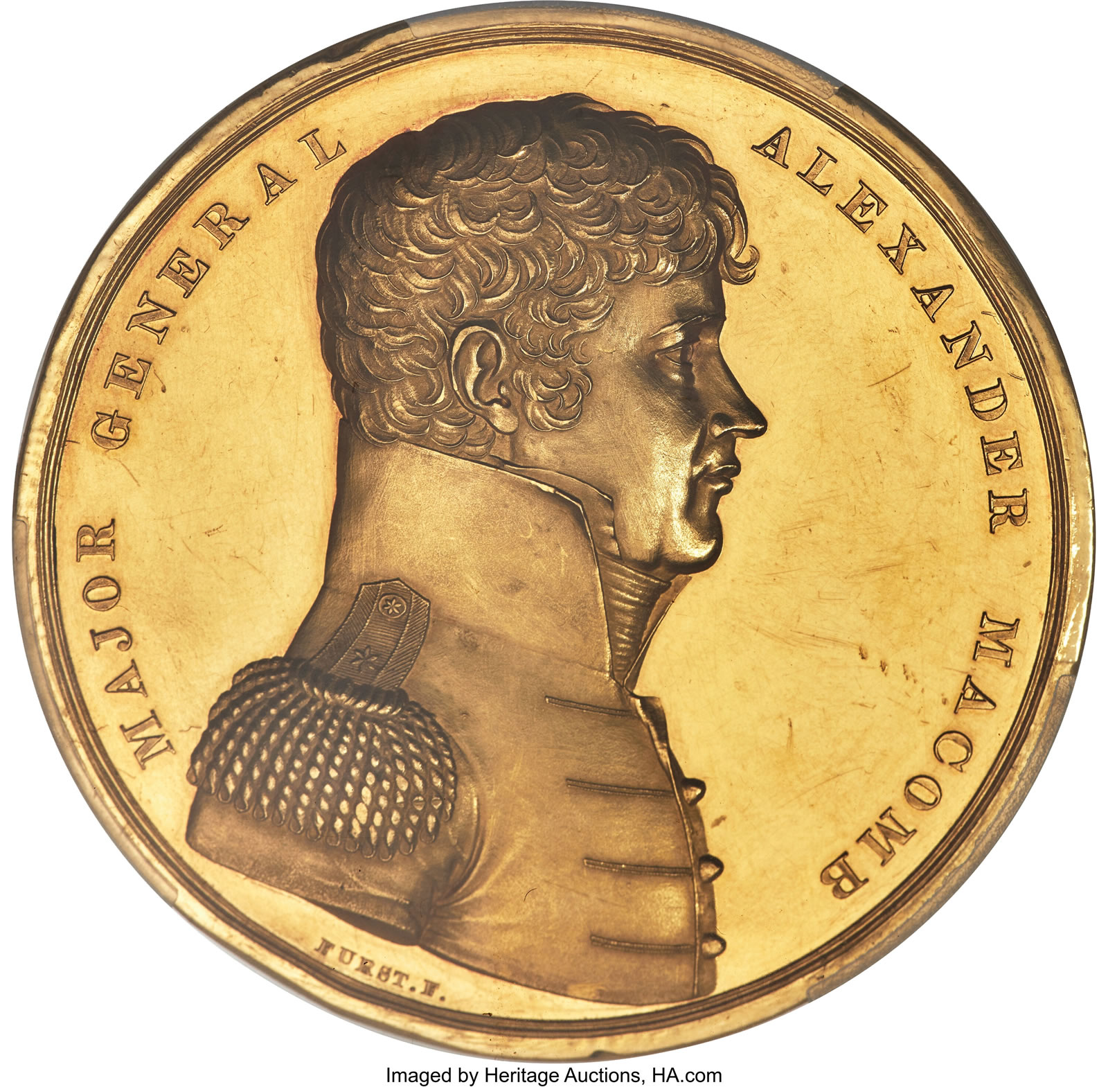 Also popular among collectors was Major General Alexander Macomb’s Congressional Gold Medal, which drew 55 bids before closing at $240,000. Macomb was one of 27 War of 1812 veterans honored with the Congressional Gold Medal, which was engraved by Moritz Fürst and was one of several adorned with a battle scene on the reverse. Although bronze duplicates were struck for decades by the U.S. Mint, only Macomb’s personal specimen, which he received directly from the hands of former President James Madison, was struck in gold.