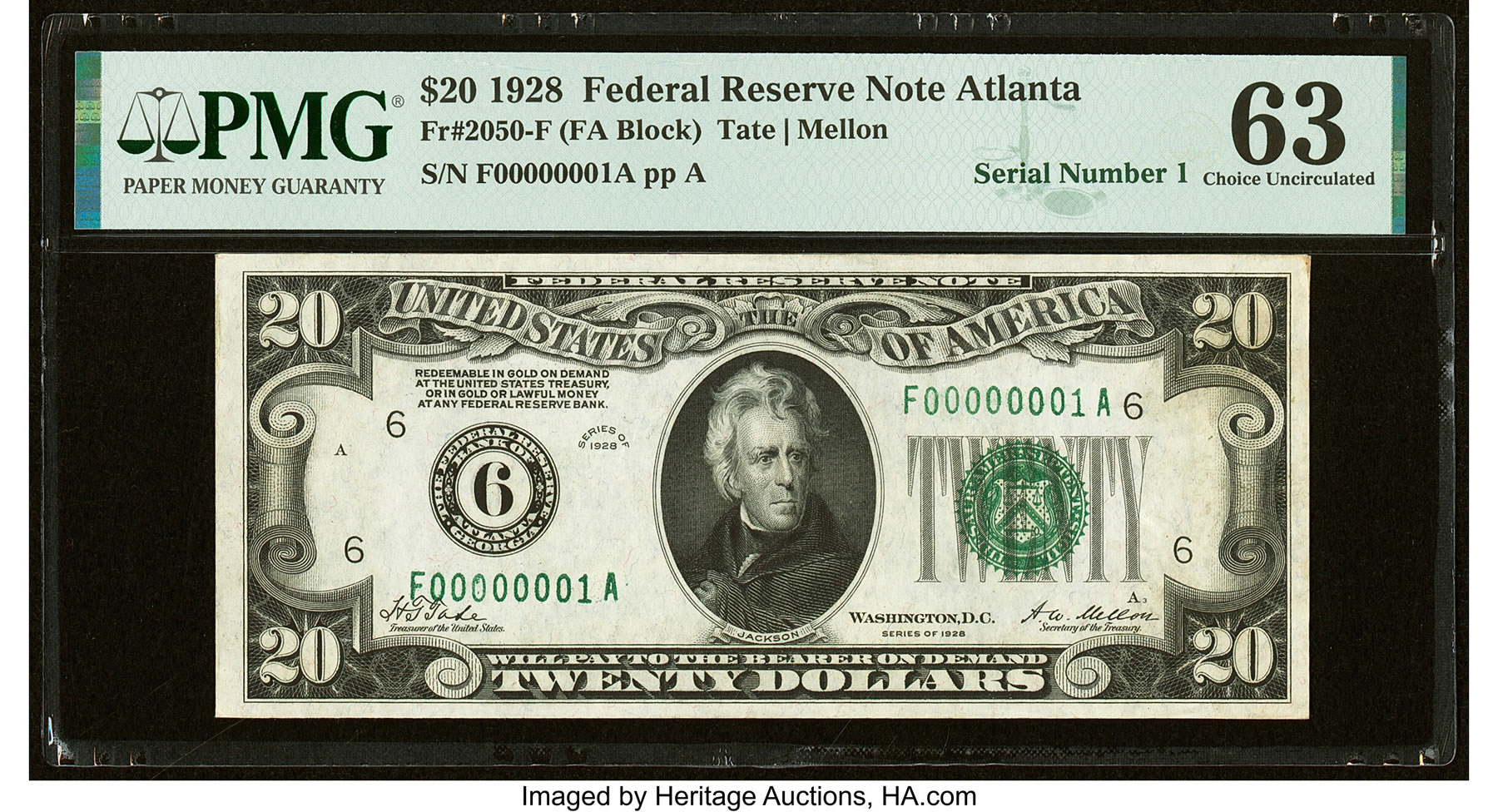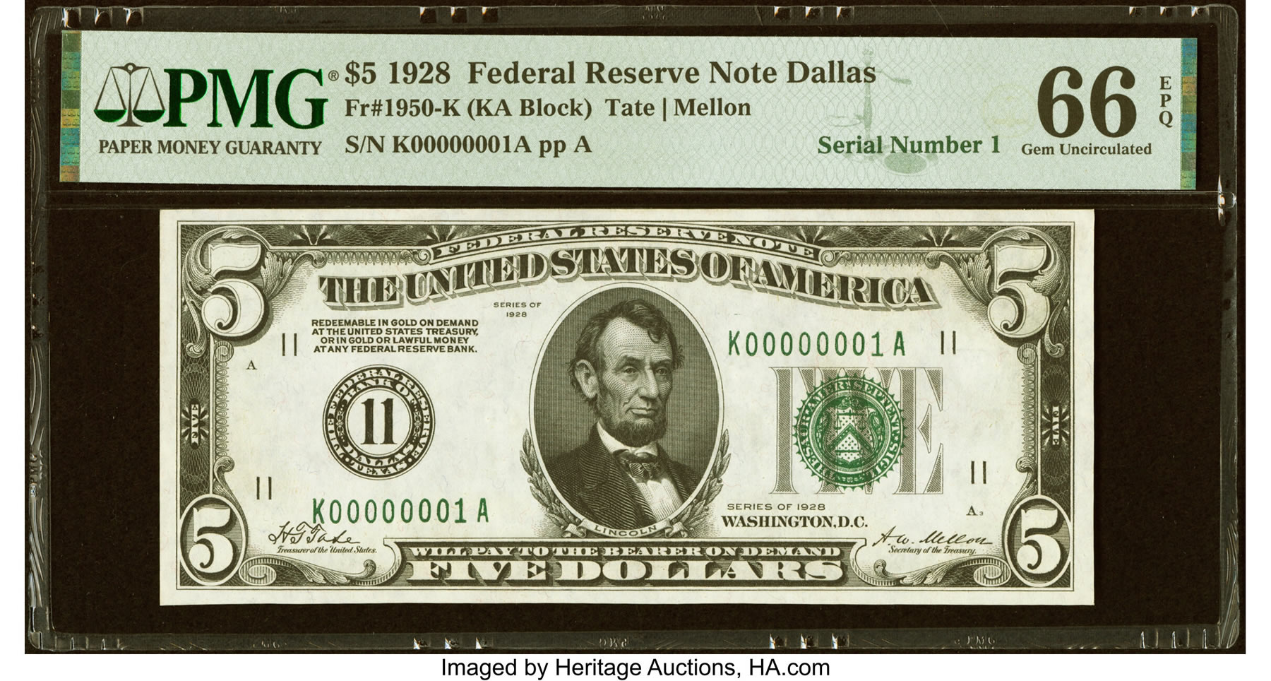 Heritage experts know of just two other regular serial number 1 examples: a Series 1928 Chicago note that resides in the Smithsonian Institution, and a Series 1934 New York note (a Series 1934 star from Kansas City also could be added to the tiny population). Other serial number 1 notes from the Gustafson Collection included a Serial Number 1 Fr. 1950-K $5 1928 Federal Reserve Note. PMG Gem Uncirculated 66 EPQ that sold for $40,800 and a Serial Number 1 Fr. 2050-F $20 1928 Federal Reserve Note. PMG Choice Uncirculated 63 that brought a winning bid of $21,600.