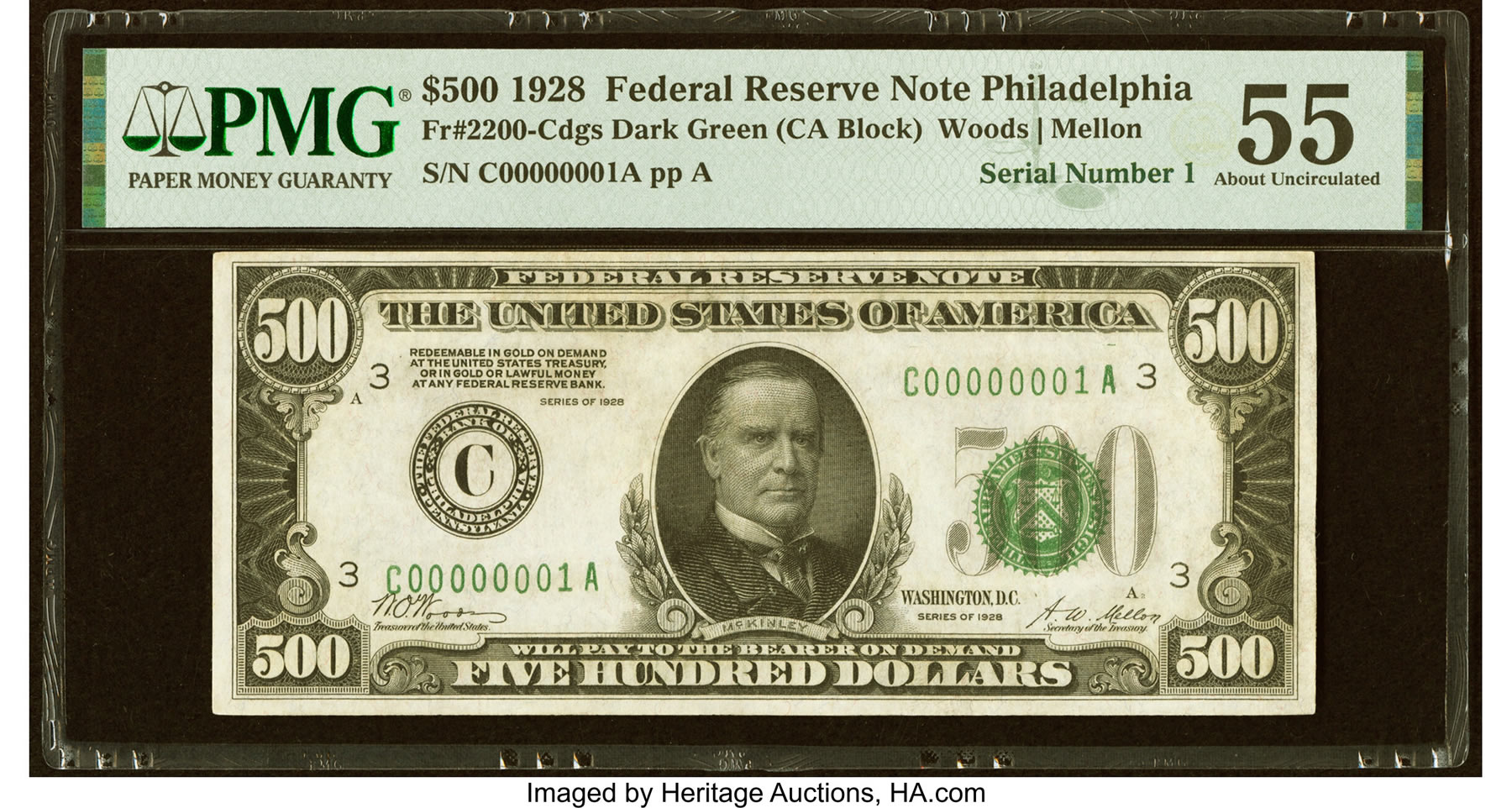 The Gustafson Collection included several notes bearing the coveted Serial Number 1, including one of just three known Serial Number 1 Fr. 2200-C $500 1928 Dark Green Seal Federal Reserve Note. PMG About Uncirculated 55 notes, which realized $114,000.
