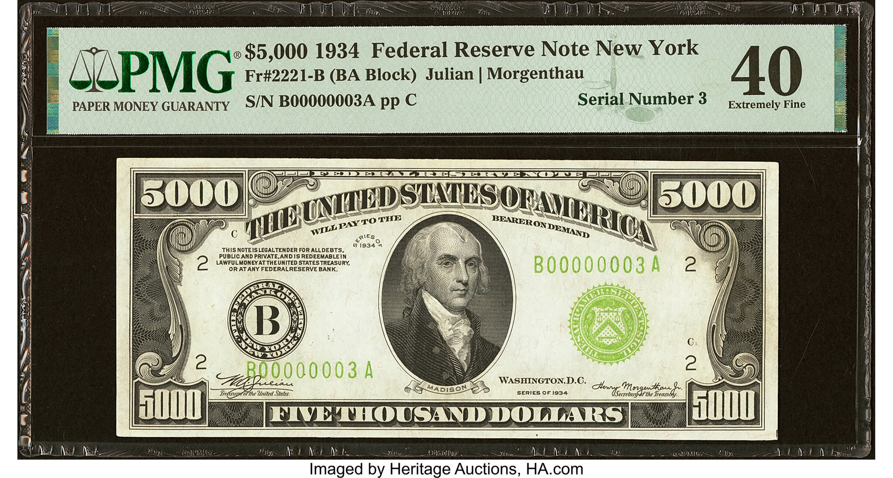 Always in high demand are notes with exceptionally low serial numbers, like the Serial Number 3 Fr. 2221-B $5,000 1934 Federal Reserve Note. PMG Extremely Fine 40 that prompted more than a dozen bids before it sold for $192,000.