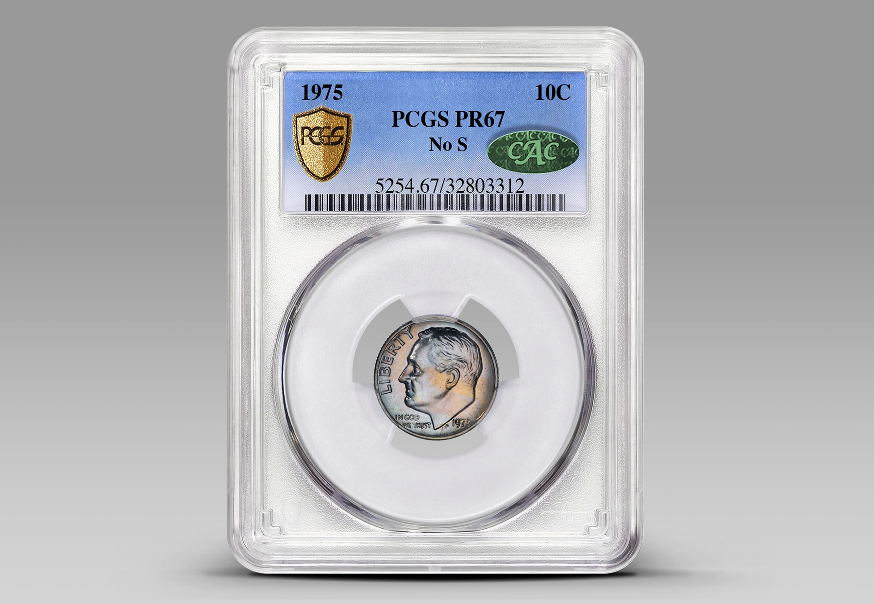 The rarity was authenticated by Professional Coin Grading Service (PCGS) and graded PCGS Proof-67. It has also been approved by Certified Acceptance Corporation (CAC). The 1975 No S Proof Dime is routinely ranked by numismatic professionals and collectors as the #1 modern issue of the United States, including the 100 Greatest U.S. Modern Coins book by Scott Schechter and Jeff Garrett.