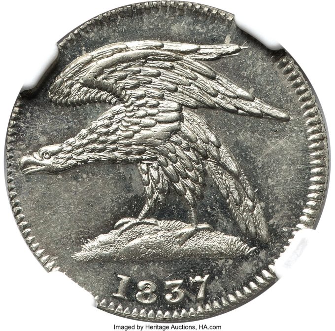 The finer of just two examples of a rare 1837 Silver 25 cents token sold for $120,000 to lead Heritage’s Robert A. Schuman, MD Collection of Hard Times Tokens Showcase Auction to $1,130,999 October 28.