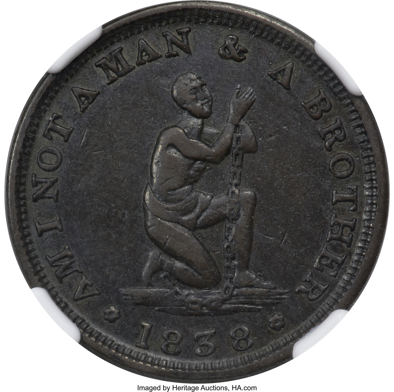 Also reaching $48,000 was an 1838 Am I Not a Man & a Brother, Low-54A, HT-82, W-11-725a, High R.7, XF45 NGC that borrows its obverse design, with a kneeling male slave in chains, from an earlier, undated British token; similar 1838-dated tokens that depict a female slave also were offered. Some modern researchers consider the male slave tokens to be pattern issues based on their rarity, although there is no contemporary evidence for such a label. This example is the second finest of four known based on NGC grading, although it has been called the finest known at other times.
