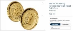 "As a tribute to the number of years that have elapsed since the Flowing Hair dollar coin was introduced, the Mint will also auction 230 one ounce, high relief, 24-karat gold coins with a "230" privy mark on December 12, 2024. The first coin will be auctioned with the die in a custom-made display box. Each of the coins will be accompanied by a certificate of authenticity hand-signed by the Honorable Ventris C. Gibson, Director of the United States Mint. Additional details about this special auction will be released at a later date."