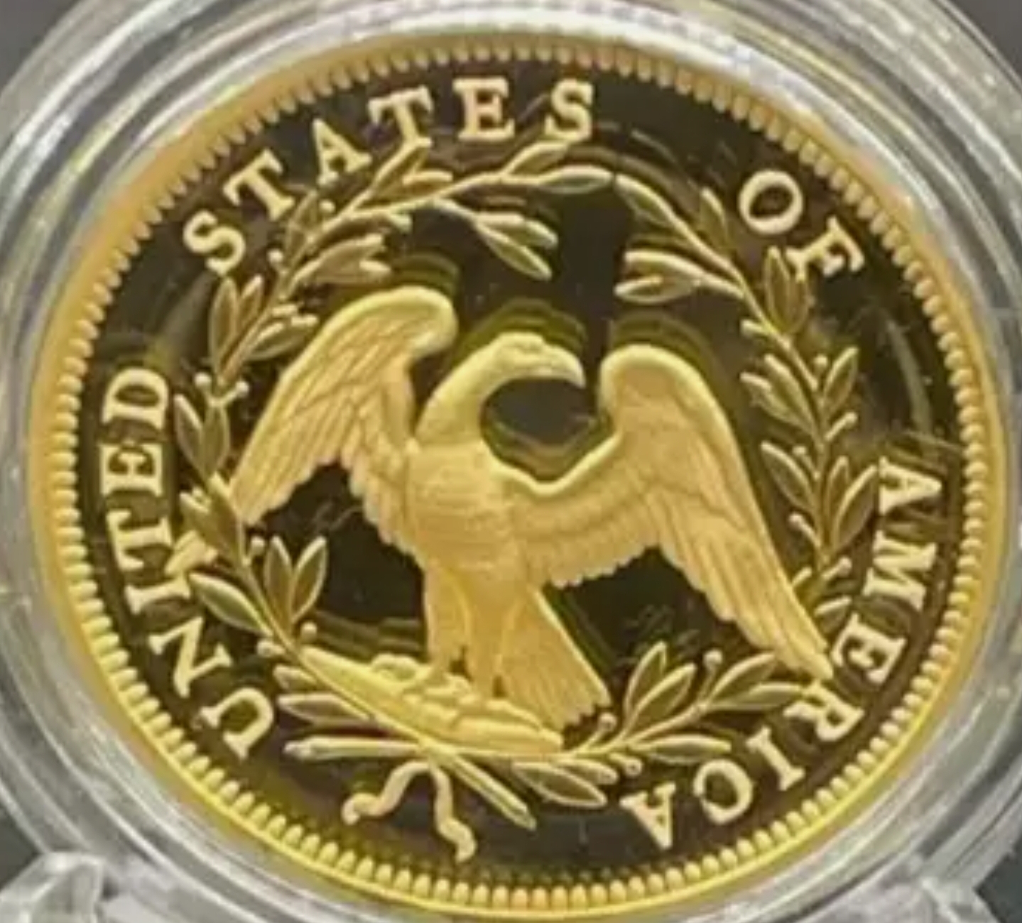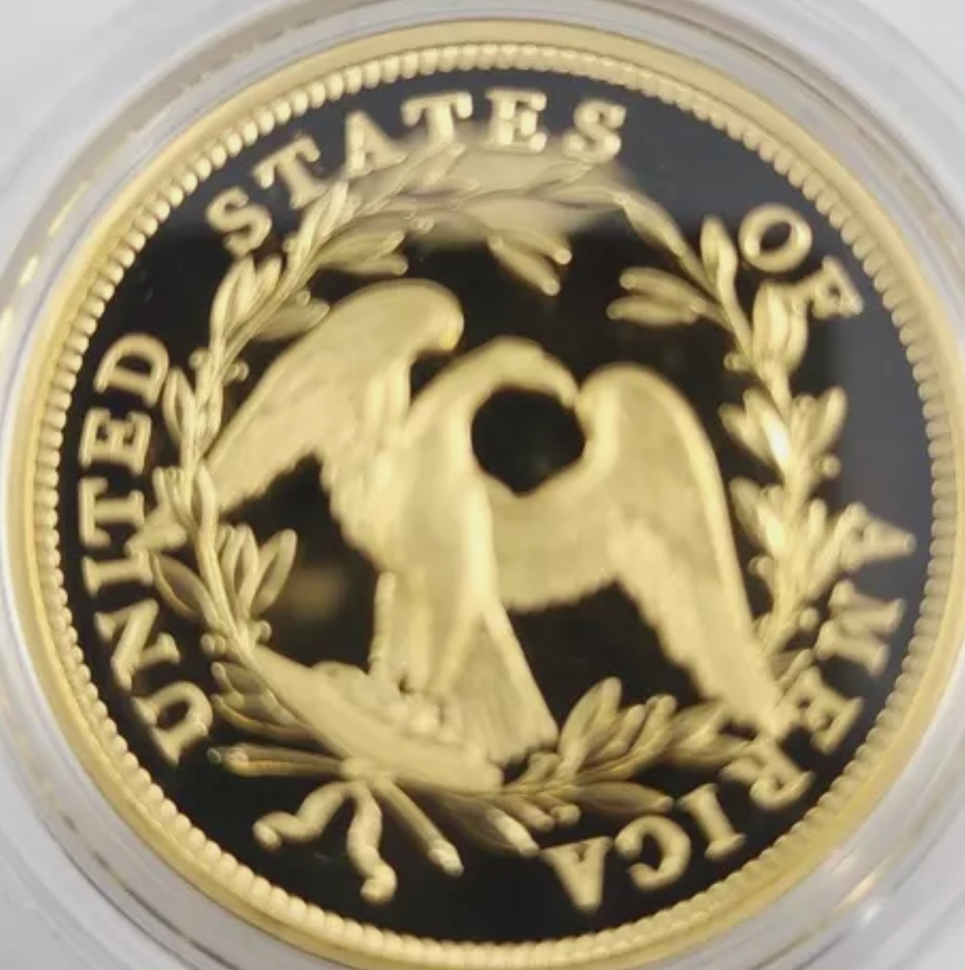 Re-sculpted by Mint Medallic Artist Eric David Custer, the reverse design shows a laurel wreath encircling an eagle with spread wings at the center, accompanied by the inscription "UNITED STATES OF AMERICA."