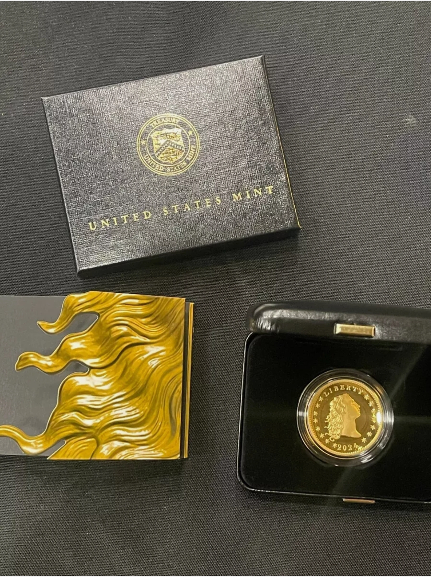 Each coin is encapsulated and presented in a black clamshell case adorned with the United States Mint seal, housed within an outer sleeve featuring a gold-embossed image of the Flowing Hair dollar. A certificate of authenticity is also included.