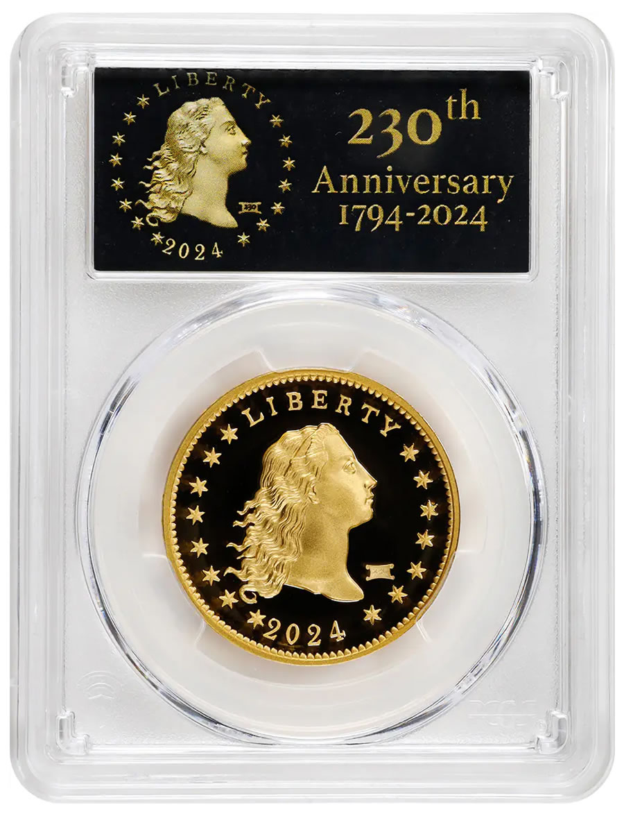 Presented in a stand-alone auction on Thursday, December 12, 2024, will be a special offering of 2024 Flowing Hair High Relief Gold coins struck to commemorate the 230th anniversary of America’s first silver dollar — the 1794 Flowing Hair dollar. These exciting gold coins serve as a faithful homage to the original dollar, featuring obverse and reverse designs re-sculpted by Mint medallic artists.