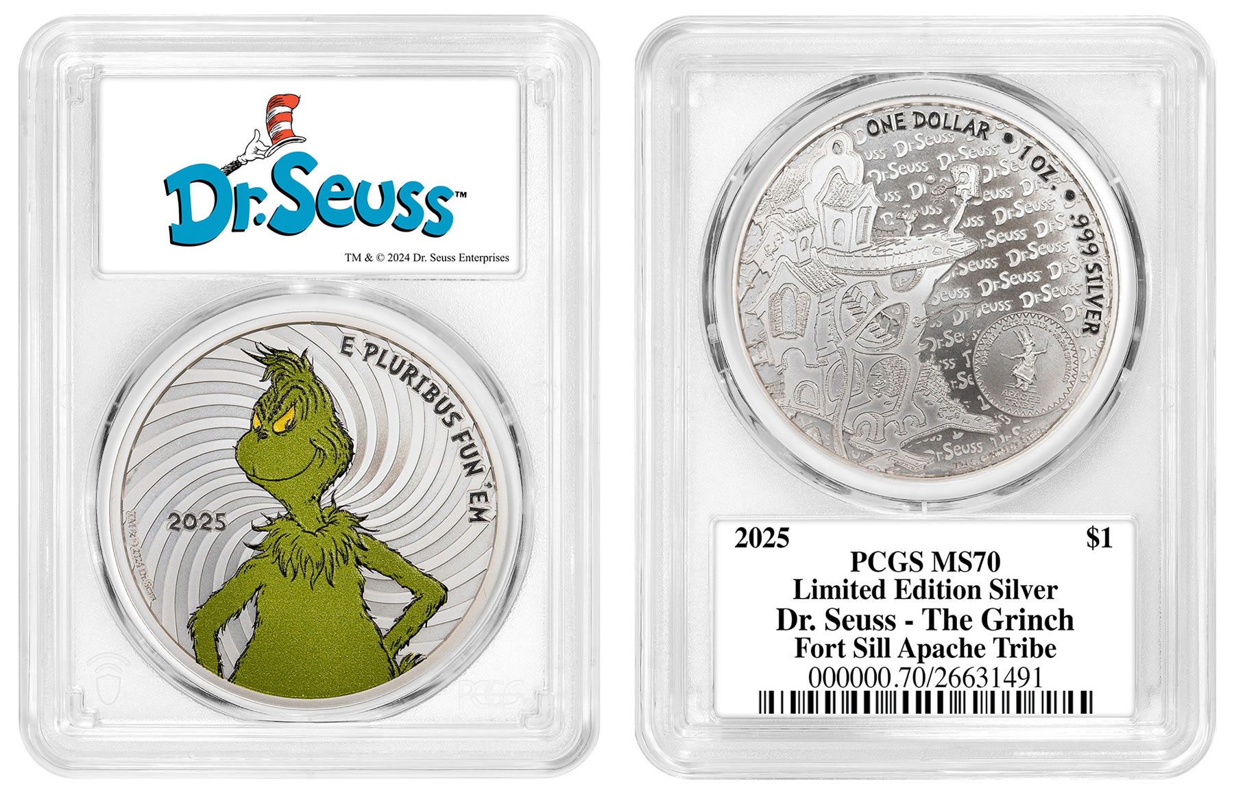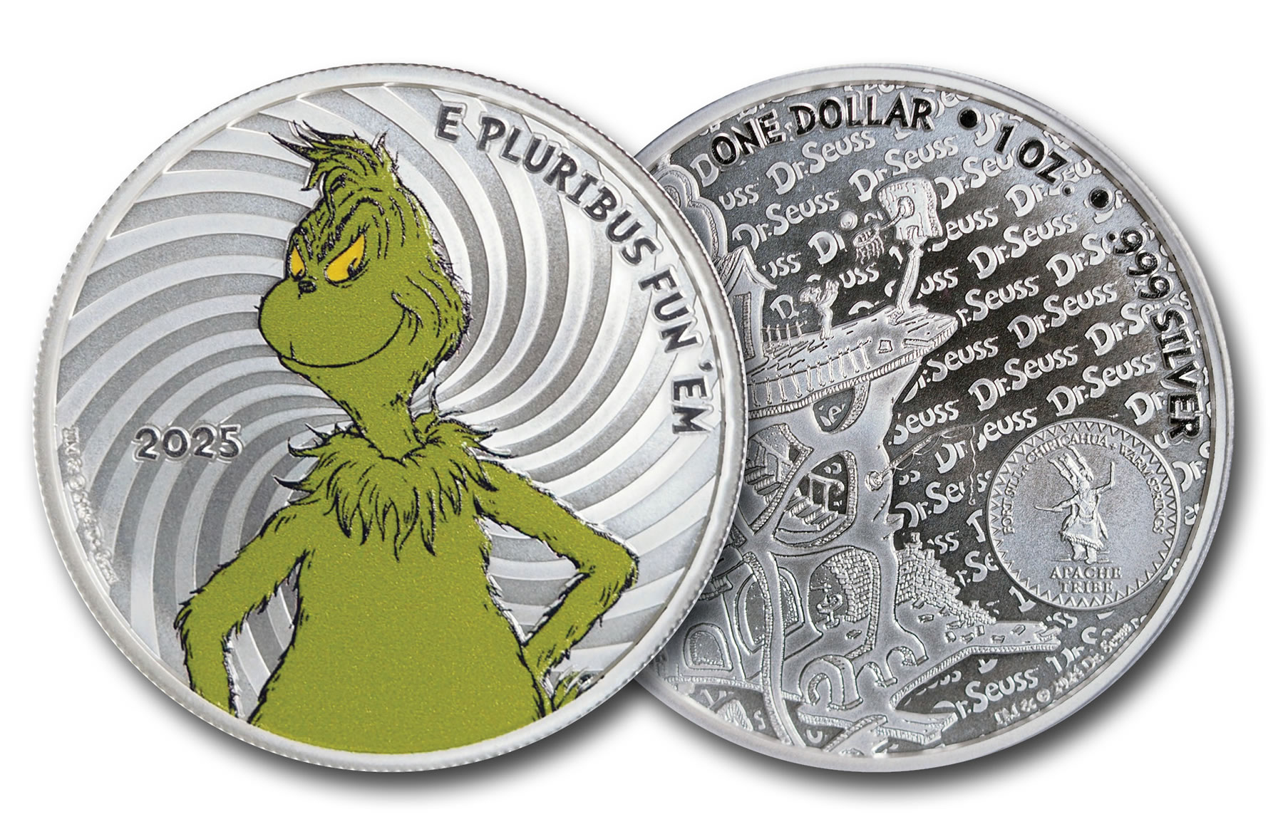 The obverse of the 2025-dated Grinch coins depict a green-colorized image of the furry Grinch with the humorous motto, "E PLURIBUS FUN ‘EM." The reverse depicts the house illustration from the book, Oh, The Places You’ll Go!, and will be a common image used on all of the initial, collectible Dr. Seuss coins. The words "Dr. Seuss" are repeated in the background and "ONE DOLLAR 1 OZ .999 SILVER" are along the top and right rim.