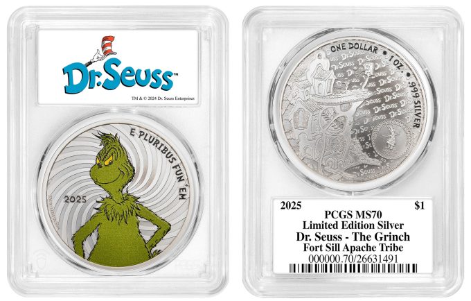 The first officially licensed Dr. Seuss coins (www.DrSeussCoins.com) depicting the famous green-colored Grinch from the popular book, How the Grinch Stole Christmas!, will be available starting on Friday, November 29, 2024. The day after Thanksgiving is commonly known as "Black Friday" for its holiday sales, but this year the devious Grinch is making it "Green Friday" for the launch of his special, green-colorized coins.