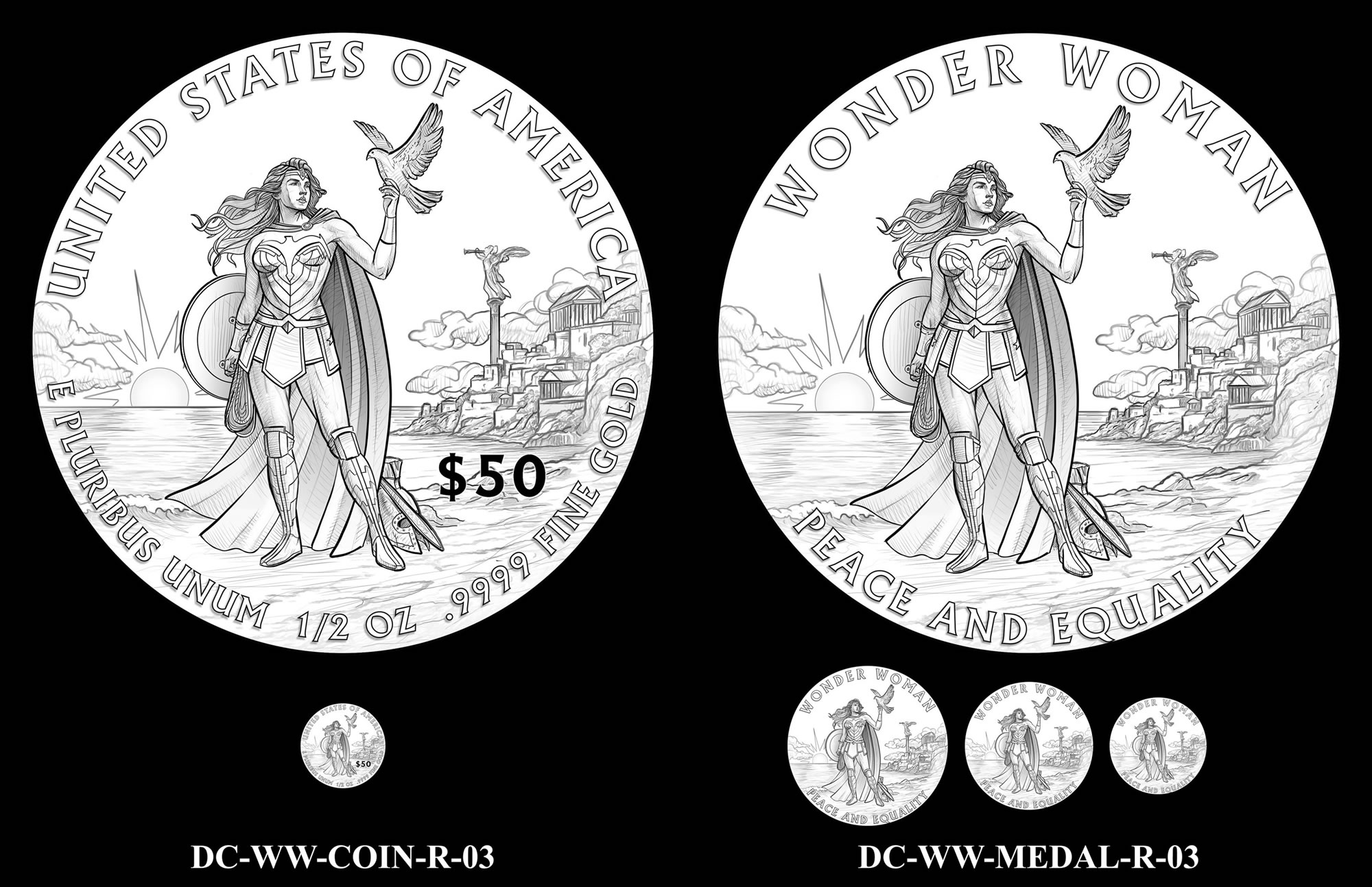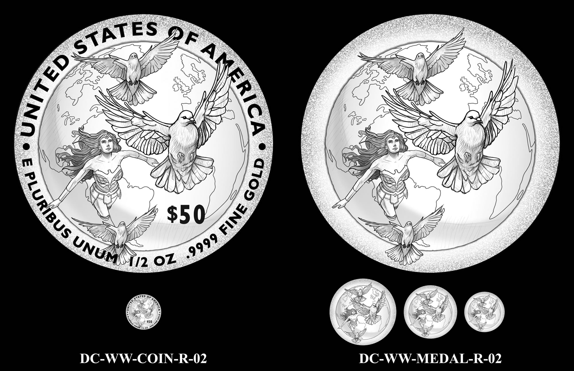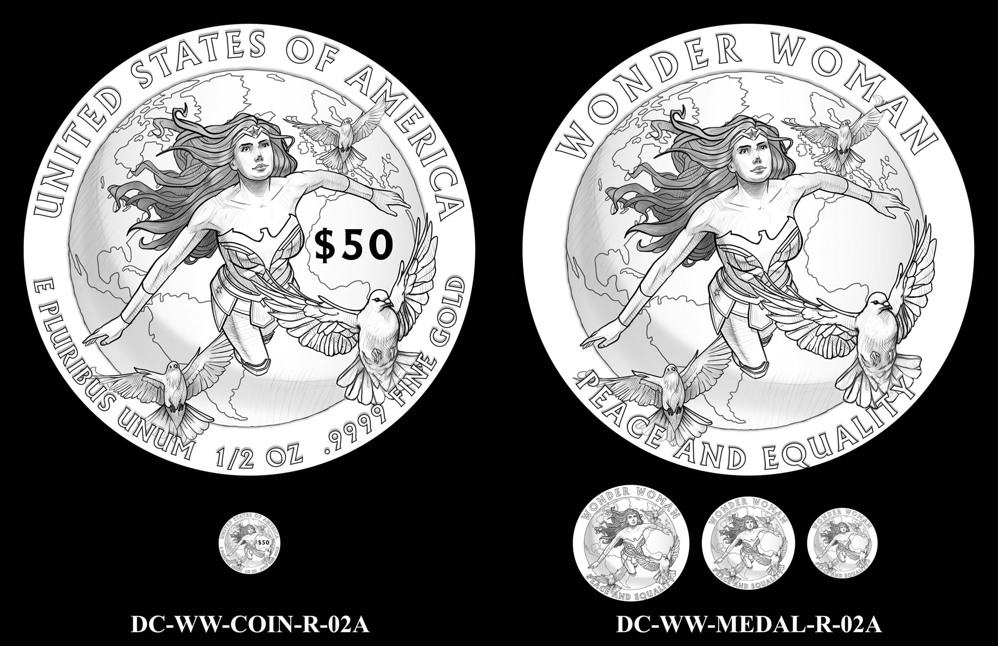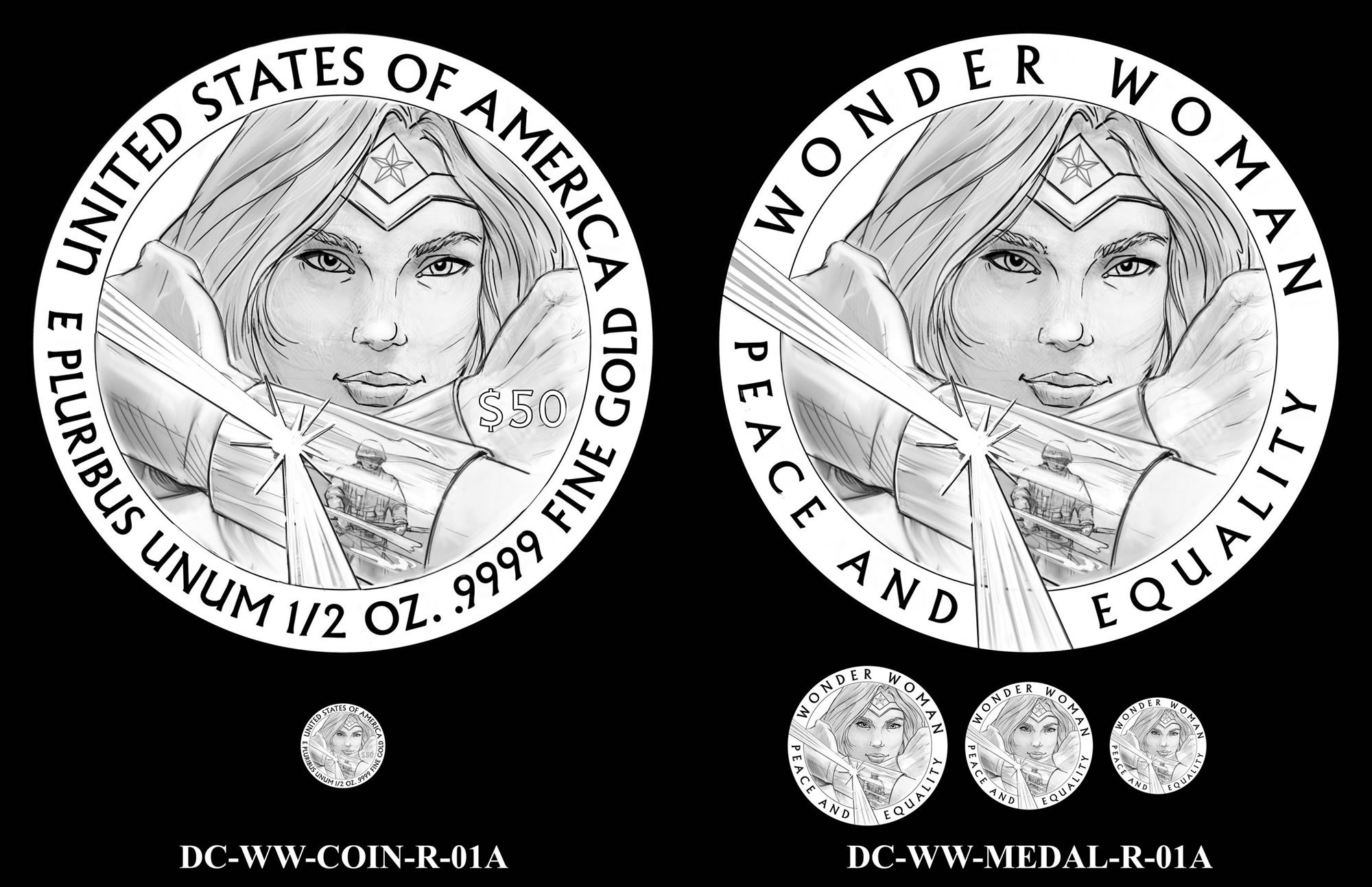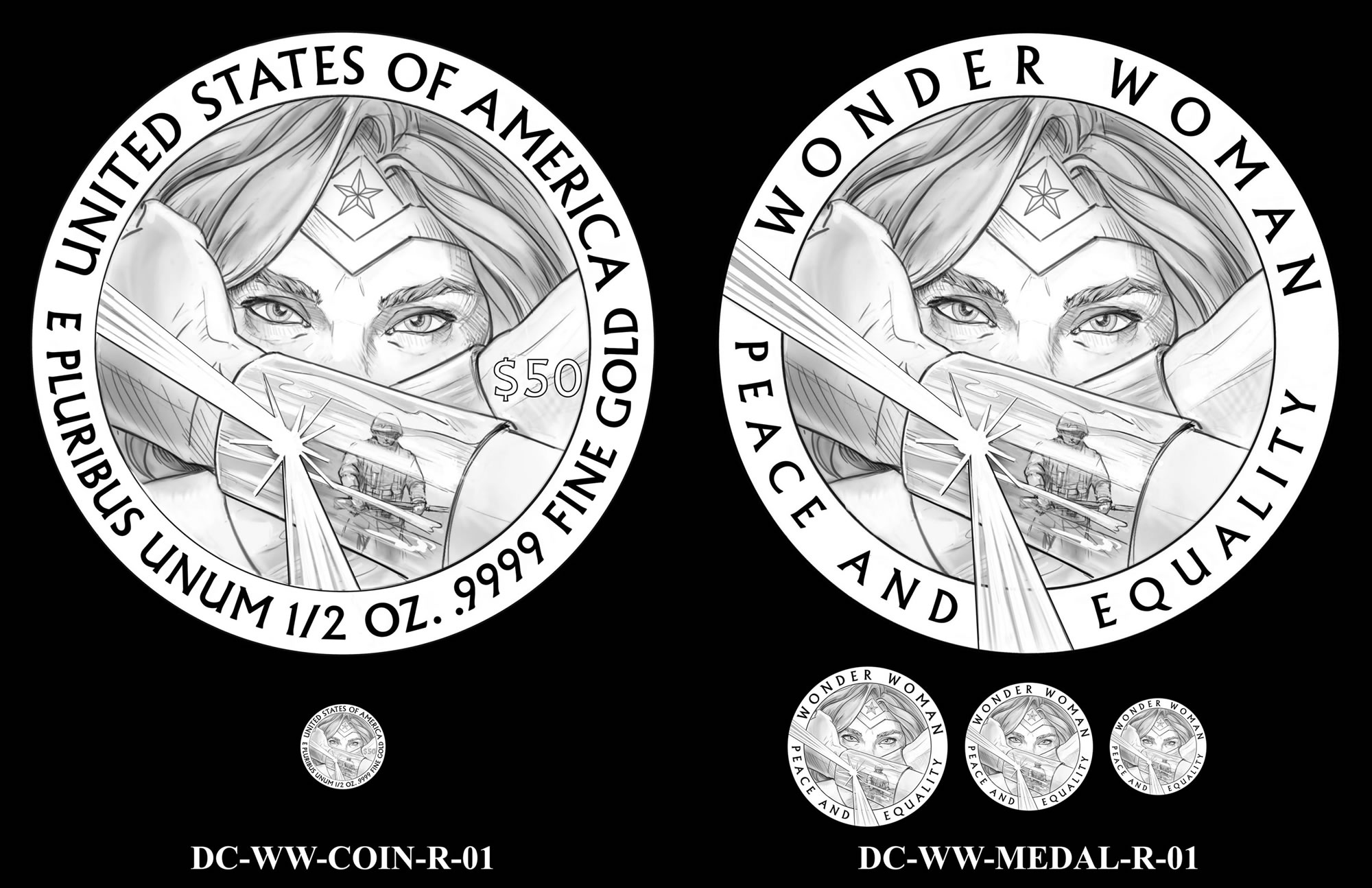 Below are U.S. Mint images of all proposed designs for the Woman Woman coin and medals.