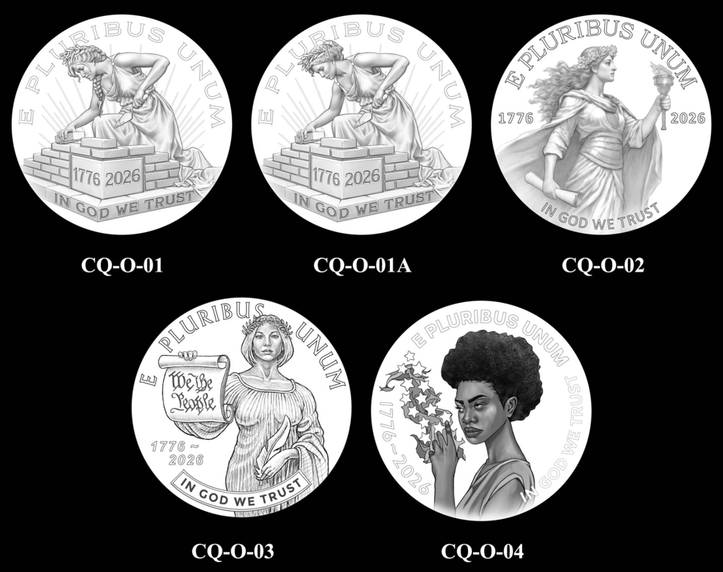 CQ-O-01 and CQ-O-01A portray Liberty, hair adorned with olive branches to symbolize peace, actively building a foundation for the United States, brick by brick.