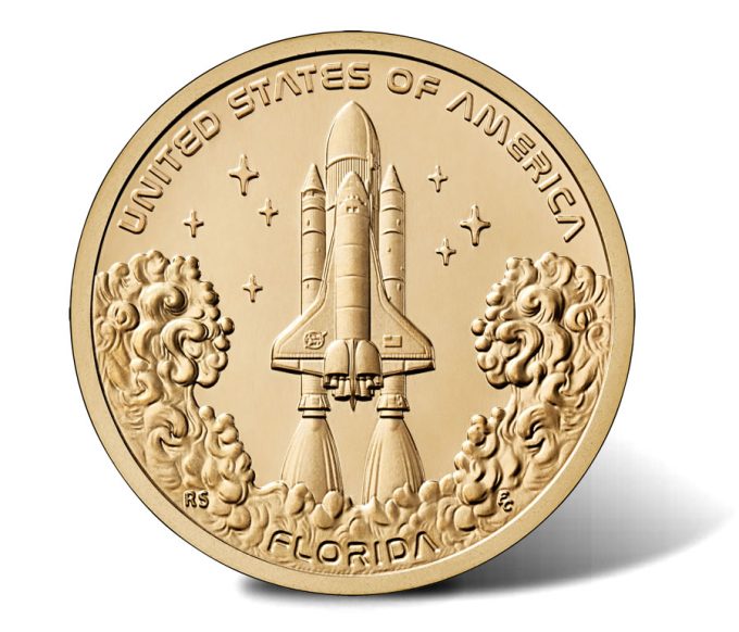 The Florida American Innovation $1 Coin honors the Space Shuttle program, showcasing a Space Shuttle liftoff with the inscription "FLORIDA" at the base. Stars flank the shuttle on either side, and the design also includes the inscription "UNITED STATES OF AMERICA."