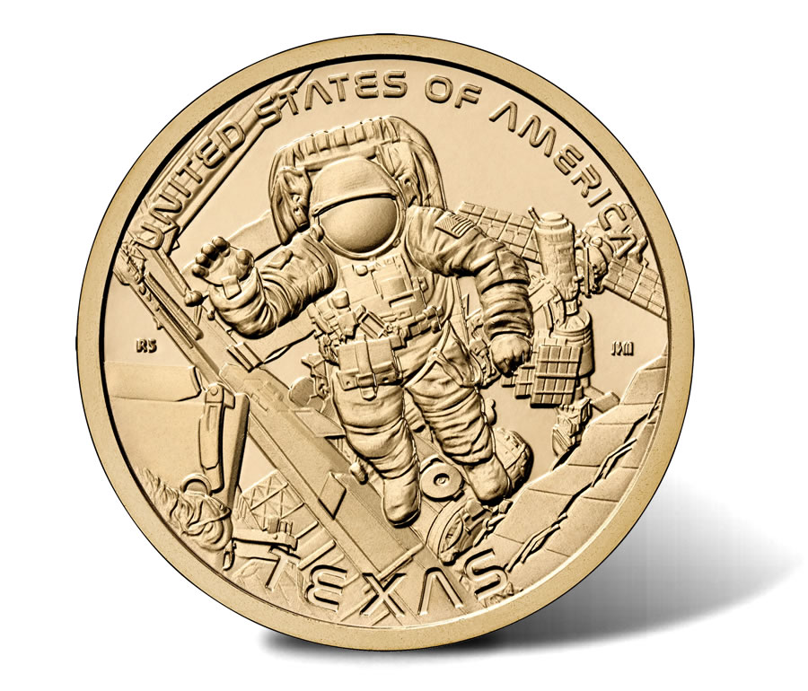 The Texas American Innovation $1 Coin pays tribute to NASA’s Mission Control at Houston’s Johnson Space Center, featuring an American astronaut performing a spacewalk outside the International Space Station. The inscriptions "UNITED STATES OF AMERICA" and "TEXAS" complete the design.