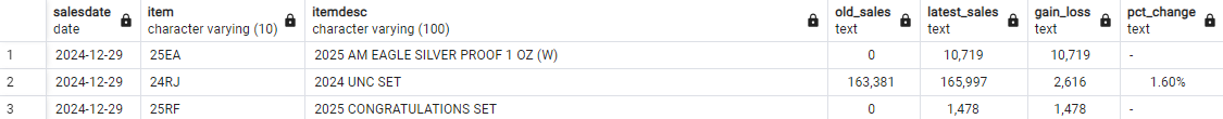 Below are tables showing the latest available sales for U.S. Mint numismatic products. The sales period covers from Dec. 29 to Jan. 5. Products with an asterisk (*) are no longer available or had no reported sales.