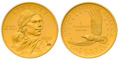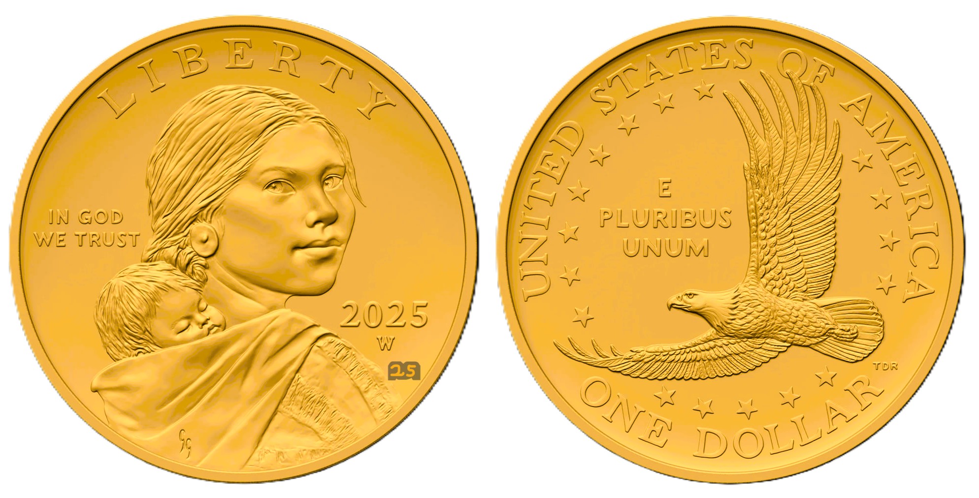 The obverse design features Sacagawea in a three-quarter profile with her infant son, Jean Baptiste, on her back. Inscriptions include "LIBERTY," "IN GOD WE TRUST," and "2025." As U.S. Mint gold coins are produced at its West Point facility, the anniversary dollar would carry a "W" mint mark.