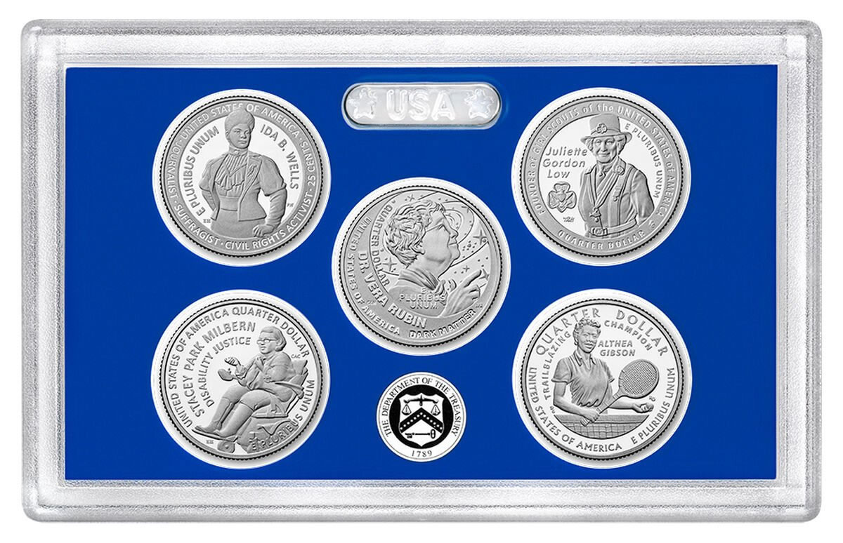 The clad set includes five San Francisco Mint-struck quarters, marking the final issues in the Mint’s American Women Quarters™ Program. Each coin is in proof finish, featuring frosted design elements and mirror-like backgrounds – achieved through multiple strikes on polished planchets using specially prepared dies.