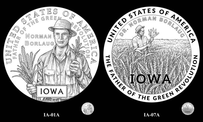 Proposed designs for the U.S. Mint’s 2026 American Innovation dollar for Iowa recognize Dr. Norman Borlaug, a Nobel Peace Prize winner and World Food Prize founder.