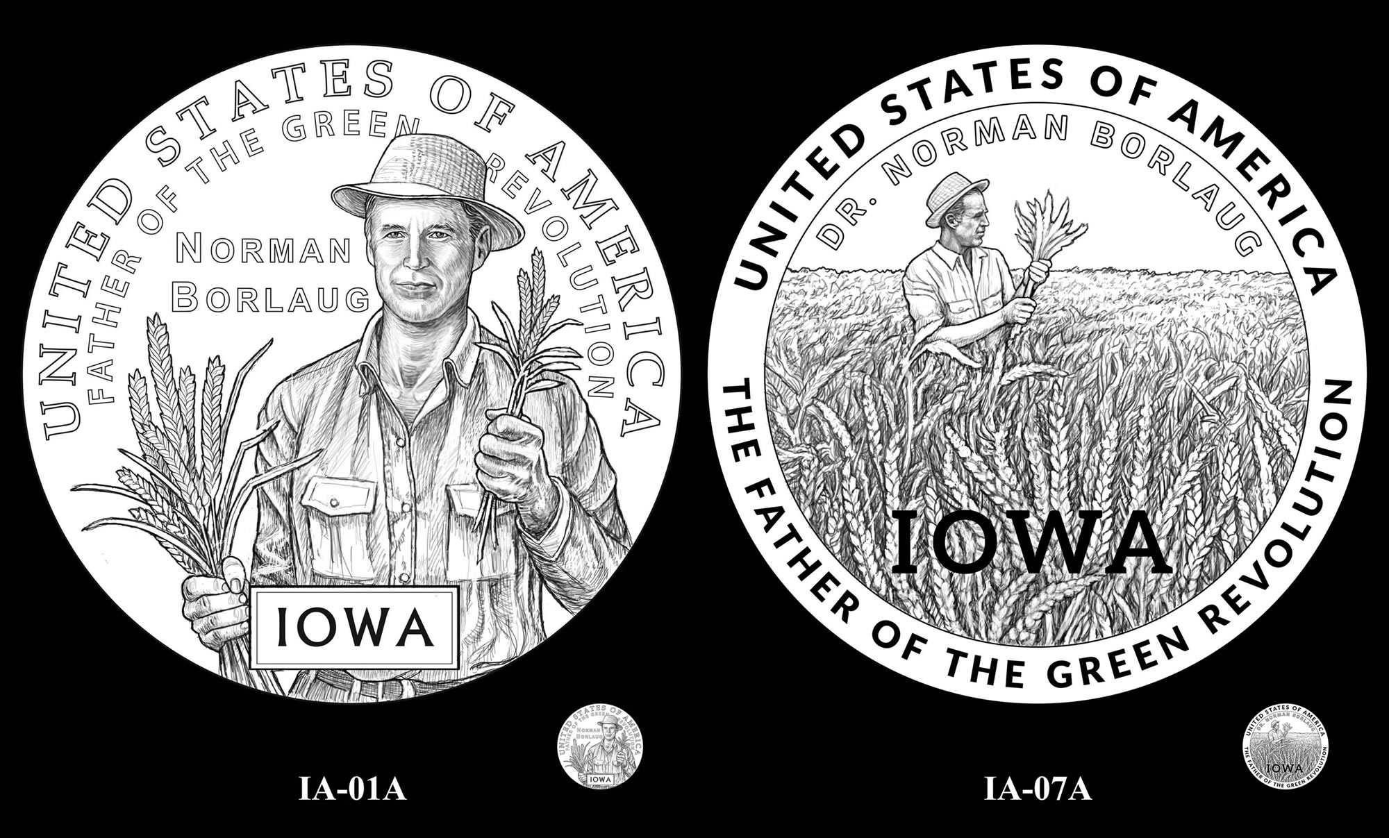 IA-01A depicts Dr. Norman Borlaug holding a sheaf of wheat and wheat stalks, highlighting his pioneering work developing resilient crops capable of feeding a growing global population. The additional inscriptions are "NORMAN BORLAUG" and "FATHER OF THE GREEN REVOLUTION."