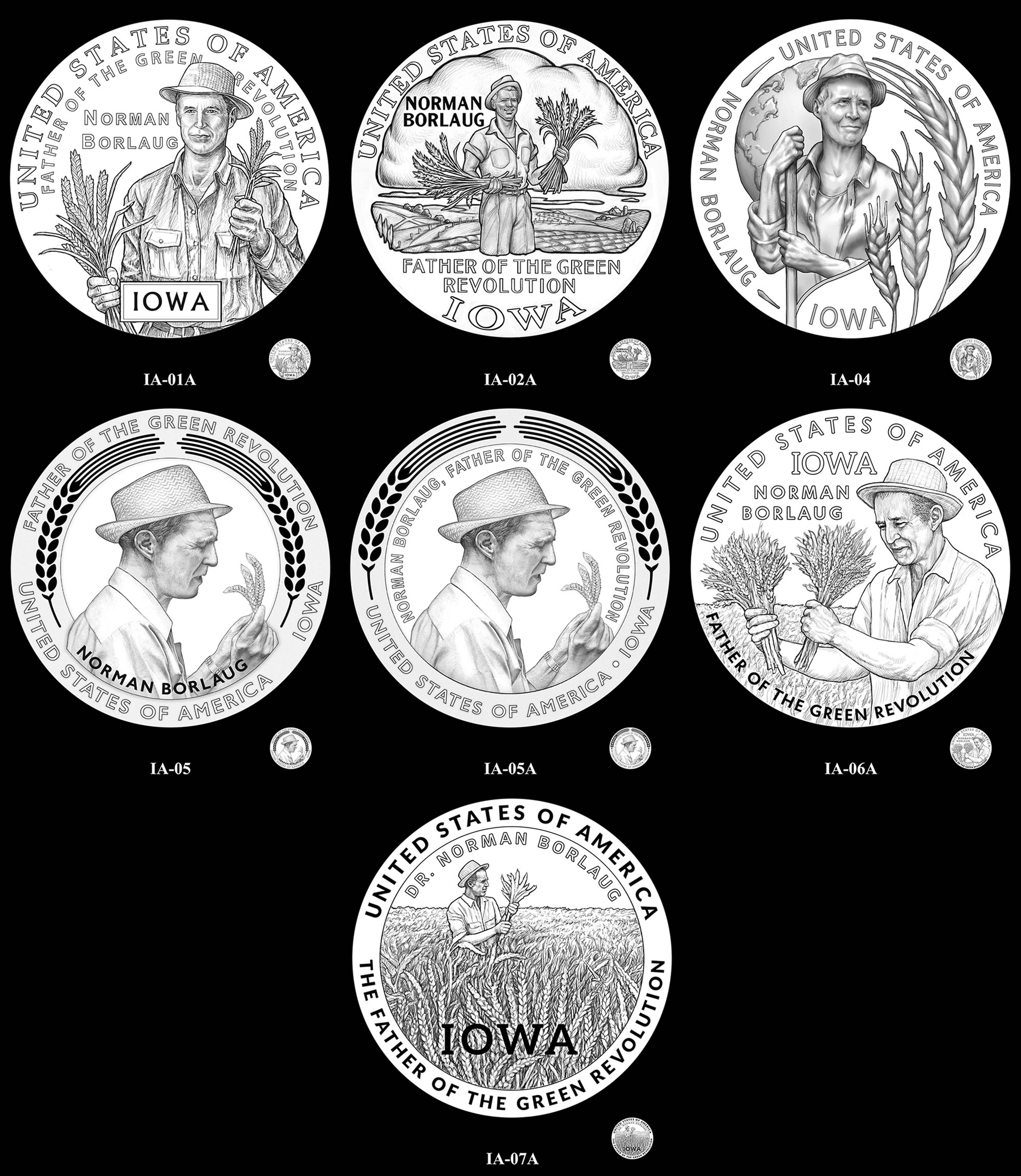 The CFA also saw merit in this design but instead endorsed IA-07A, which portrays Dr. Borlaug standing in a wheat field gathering crop samples, reflecting his hands-on approach to agricultural science. The commission felt this design honored both the innovator and his contributions to advancing agricultural productivity.
