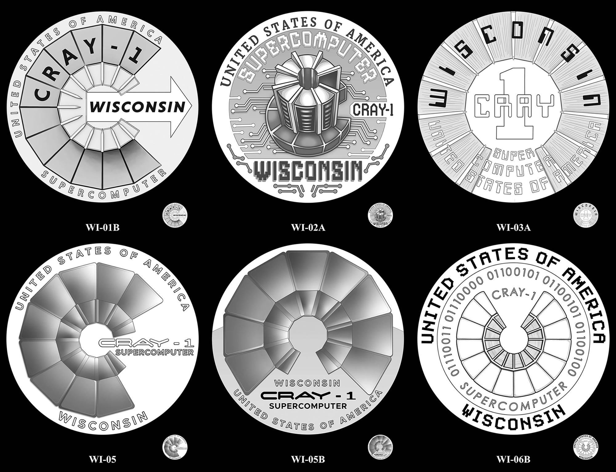 Design WI-05, featuring a stylized aerial view of the Cray-1, emerged as the preferred choice, receiving support from the Office of the Governor of Wisconsin and recommendations from both advisory bodies. Inspired by typography associated with early supercomputers, the design not only captures the Cray-1’s distinctive shape but also subtly forms a "C" for both "Cray-1" and "computer."