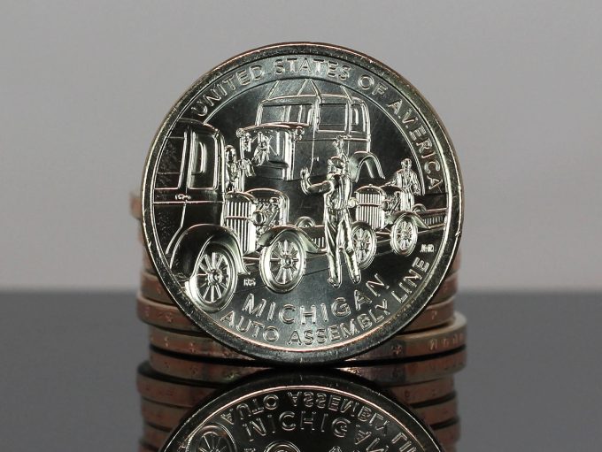 Issued on April 8, the Michigan innovation dollar honors Ransom Olds and his groundbreaking assembly line concept. Available in 25-coin rolls and 100-coin bags, the products posted opening sales of 887,225 coins – a solid mid-range start among recent issues.
