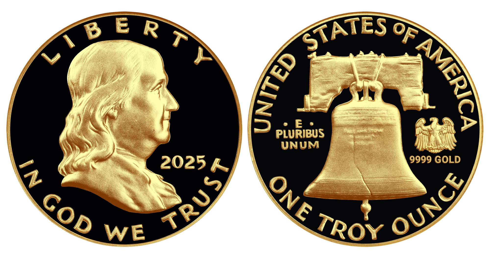 The obverse has a large portrait of Franklin facing right with the date 2025, the word LIBERTY at the top, and the motto IN GOD WE TRUST on the bottom.