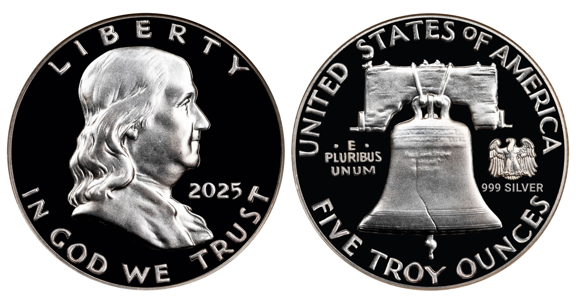The limited-edition precious metal commemoratives that will be featured in programs on the Fox Business and Bloomberg cable television networks are struck in one-ounce gold and five-ounce silver versions. Their design is a tribute to the iconic Franklin half dollars produced by the United States Mint from 1948 to 1963.