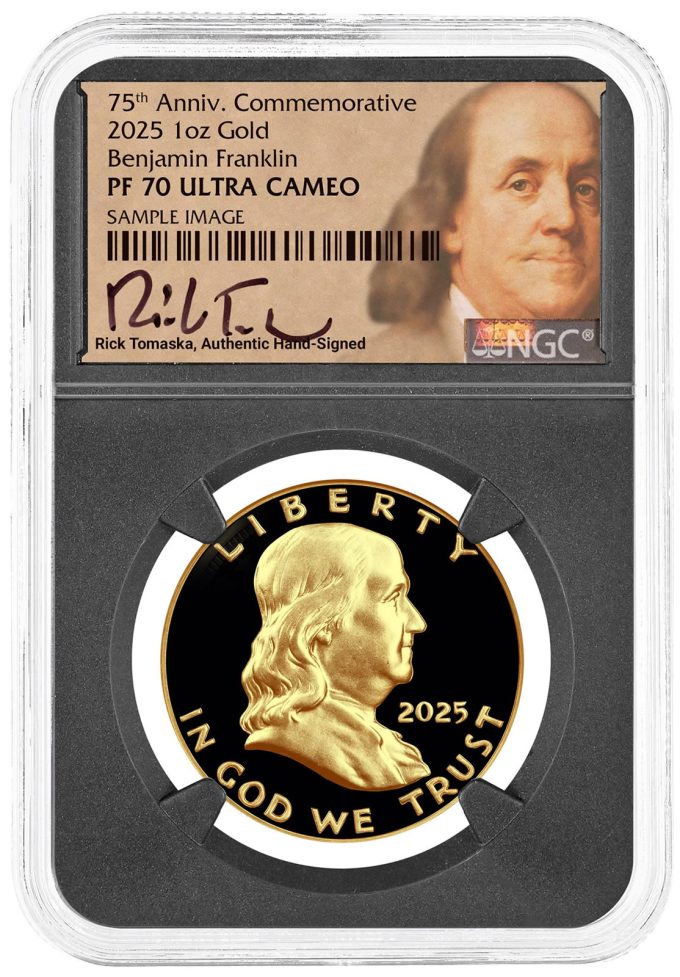 Expertly engraved by former United States Mint Medallic Artist, Sculptor, and Engraver Michael Gaudioso, each available Franklin commemorative has been graded Proof 70 Ultra Cameo by Numismatic Guaranty Company (NGC) and encapsulated with a special RCTV Signature Series insert label personally signed by Tomaska.