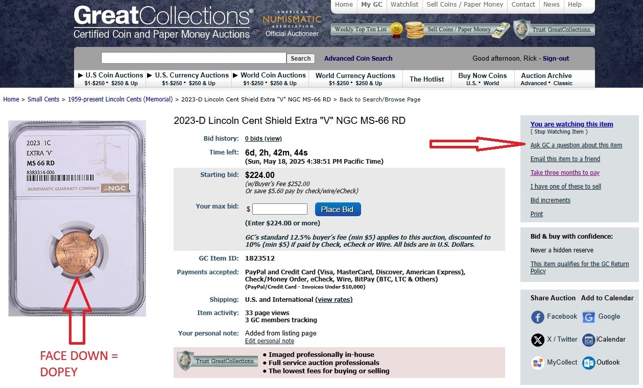 Rick in the previous thread said: “PS: One of my GC saved searches is for the Extra V.” Since you’re a customer of GC, although NOMB, wondered if you might want to drop Ian or Raeleen an e-mail, letting them know they have a couple listings that are incorrect? Listings(below) show/read or are worded as “D” specimens. There are two 2023 Extra V coins listed as D mint, versus what they are actually selling and have pictured, which they are “P”/no mint mark coins and labels. “2023-D Lincoln Cent Shield Extra “V” NGC MS-66 RD” “2023-D Lincoln Cent Shield Extra… Read more »