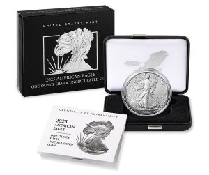 On May 20, the United States Mint released the 2025-W Uncirculated American Silver Eagle, priced at $91 – the highest debut price in the coin’s history. Struck from 1 ounce of .999 fine silver, the coin is available in two product options: individually to collectors (product code 25EG) and in 40-coin bulk packs to qualifying buyers (product code 25EG040).