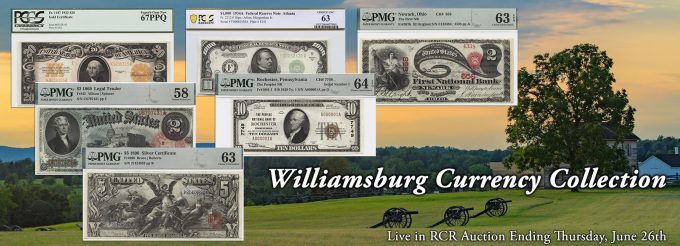 The series opens with the Williamsburg Currency Collection, a fresh-to-market assemblage featuring rarities such as obsolete banknotes, silver and gold certificates, fractional currency, and Confederate issues. Bidding is now underway and will close on Thursday, June 26.