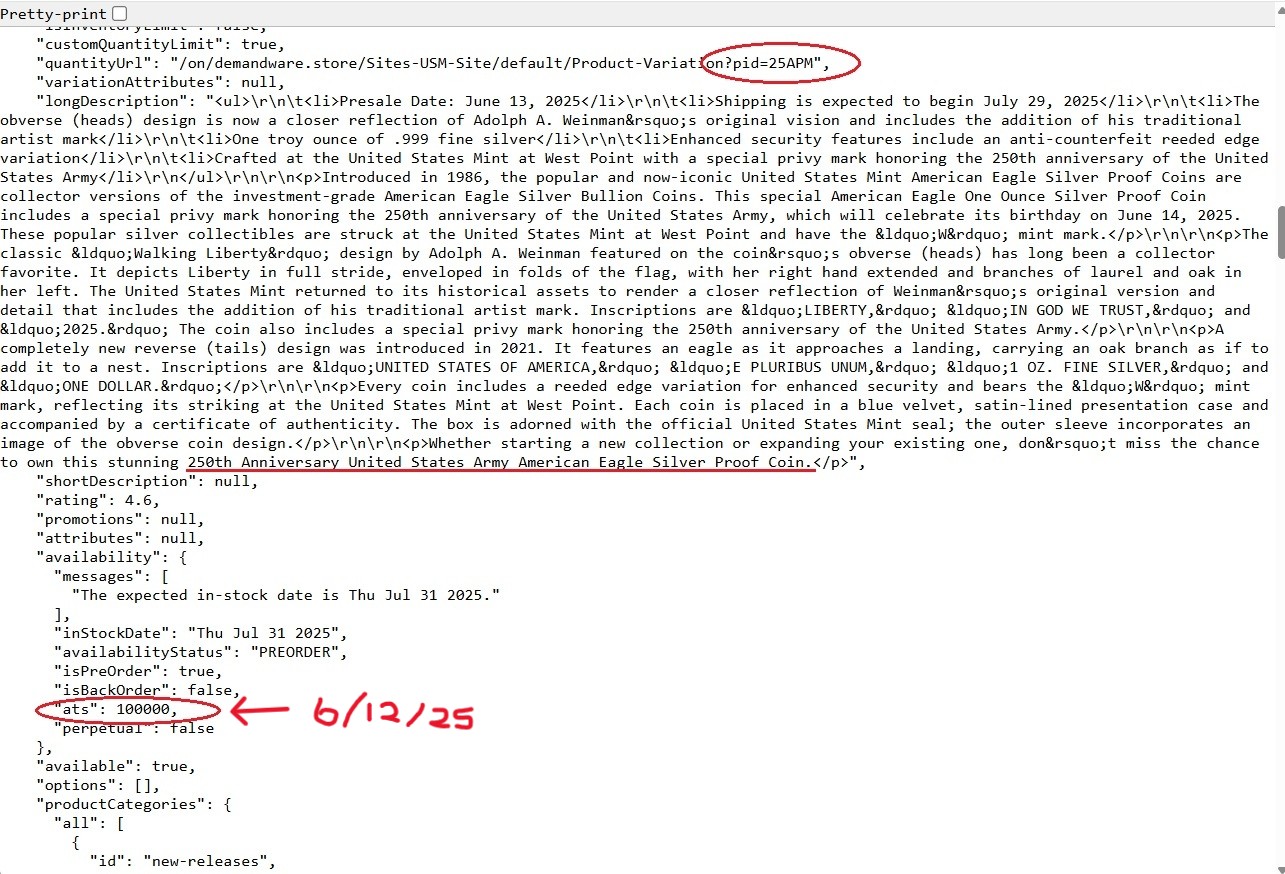 Elsewhere, the Mint’s weekly sales data included a total of 10,170 for the upcoming privy-marked 250th Anniversary Army 2025-W Proof American Silver Eagle. Pre-sales for the collectible begin on Friday, June 13, at noon ET. It is not unusual for the Mint’s weekly sales reports to show early figures for upcoming releases, though they typically reflect orders claimed through subscriptions. The proof Silver Eagle has a mintage limit of 100,000 and an initial household order limit of one, recently reduced from three.