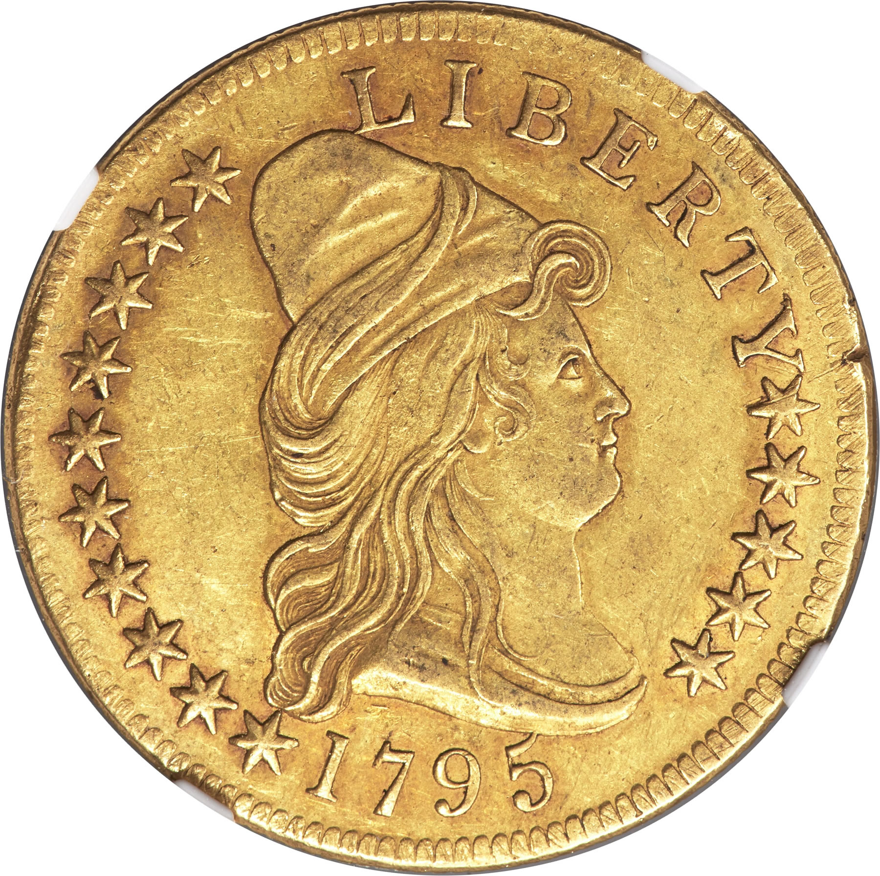 A 1795 Capped Bust 13 Leaves Right Eagle, AU55 NGC is an attractive AU specimen. After the Philadelphia Mint began circulating gold coins in 1795 with an early mintage of half eagles, its focus turned to eagles, including an initial batch of 1,097, likely of the BD-1 variety. The offered coin represents the BD-1 variety and may have been included in the first delivery. A total of 5,583 Capped Bust Right eagles were struck in late 1795 – some of which may have been struck early in 1796, as well. The surviving BD-1 population has been estimated at 225-325 in all grades.