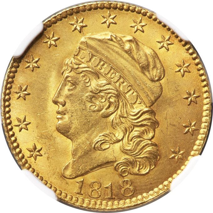 An 1818 BD-2 Half Eagle, MS64 NGC is tied for the fifth-finest 1818 half eagle of any variety, from a suggested total population of just 200-250 coins. The BD-2 die pair is the so-called "STATESOF" reverse, with the "S" in "STATES" over the first "U" in "UNUM."
