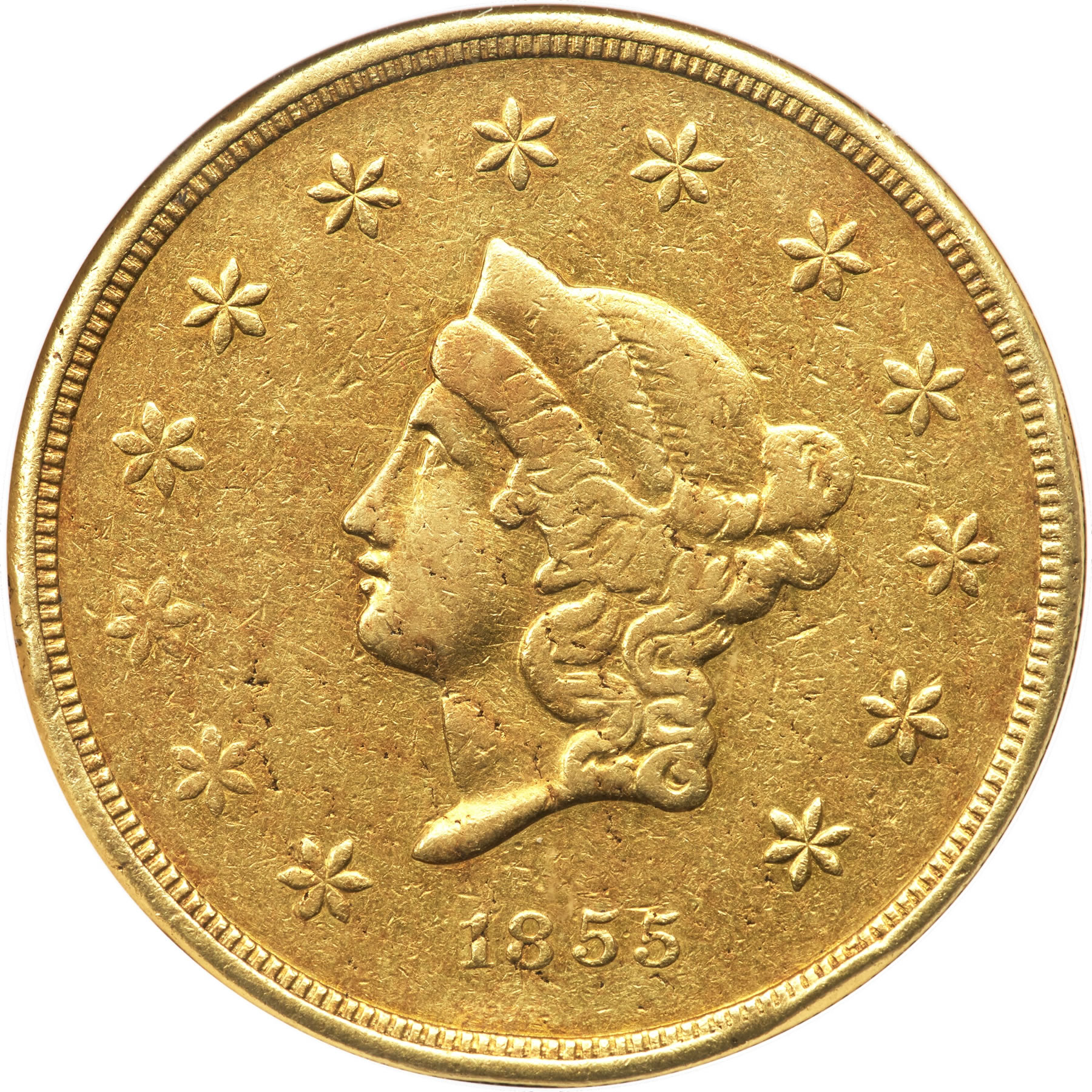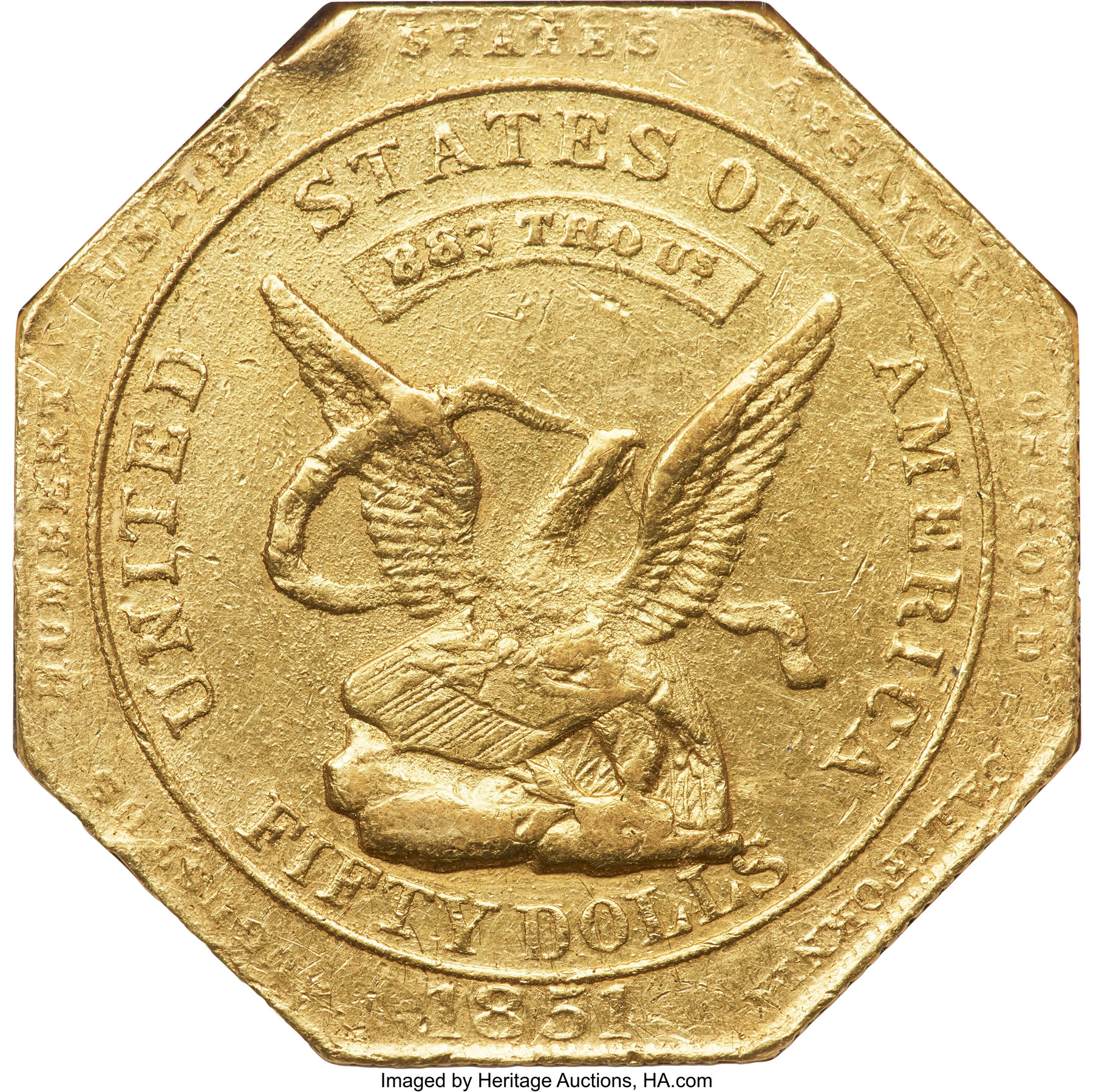Also offered is an 1851 $50 Humbert Fifty Dollar, Reeded Edge, 887 Thous. MS60 NGC. K-7, R.5. The K-7 fifty is rare and desirable in all grades, but particularly so in Mint State condition. Because of its contract to manage the United States Assay Office of Gold and the accompanying support of United States Assayer Augustus Humbert, Moffat & Company briefly became the sole surviving firm among all California private minters in 1851. It was respected for its honesty and reliability, but roundly criticized for the cumbersome octagonal fifties it produced that were considered a "decided nuisance." This K-7 fifty dollar gold piece features Albert Kuner’s new reverse die paired with the late die state 887 Thous obverse, with extensive die rust and light abrasions visible in the fields. This example is one of just two carrying a grade of 60; there are only 23 with higher grades.