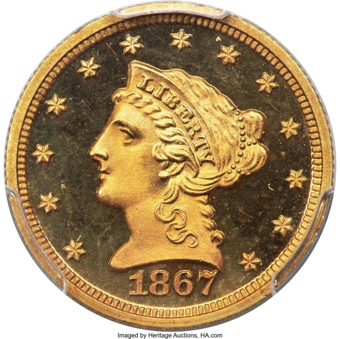 An 1867 Quarter Eagle, PR67 Deep Cameo PCGS is tied for the finest certified example. The Philadelphia Mint struck a relatively generous mintage of 50 proof Liberty quarter eagles for collectors in 1867, along with a meager business-strike production of 3,200 pieces. Despite the larger-than-average mintage, the 1867 proof quarter eagle is just as rare as the proofs of earlier years that had half the production totals. It is believed that many examples went unsold and were melted after the end of the year. John Dannreuther estimates the surviving population at 14-16 examples in all grades.