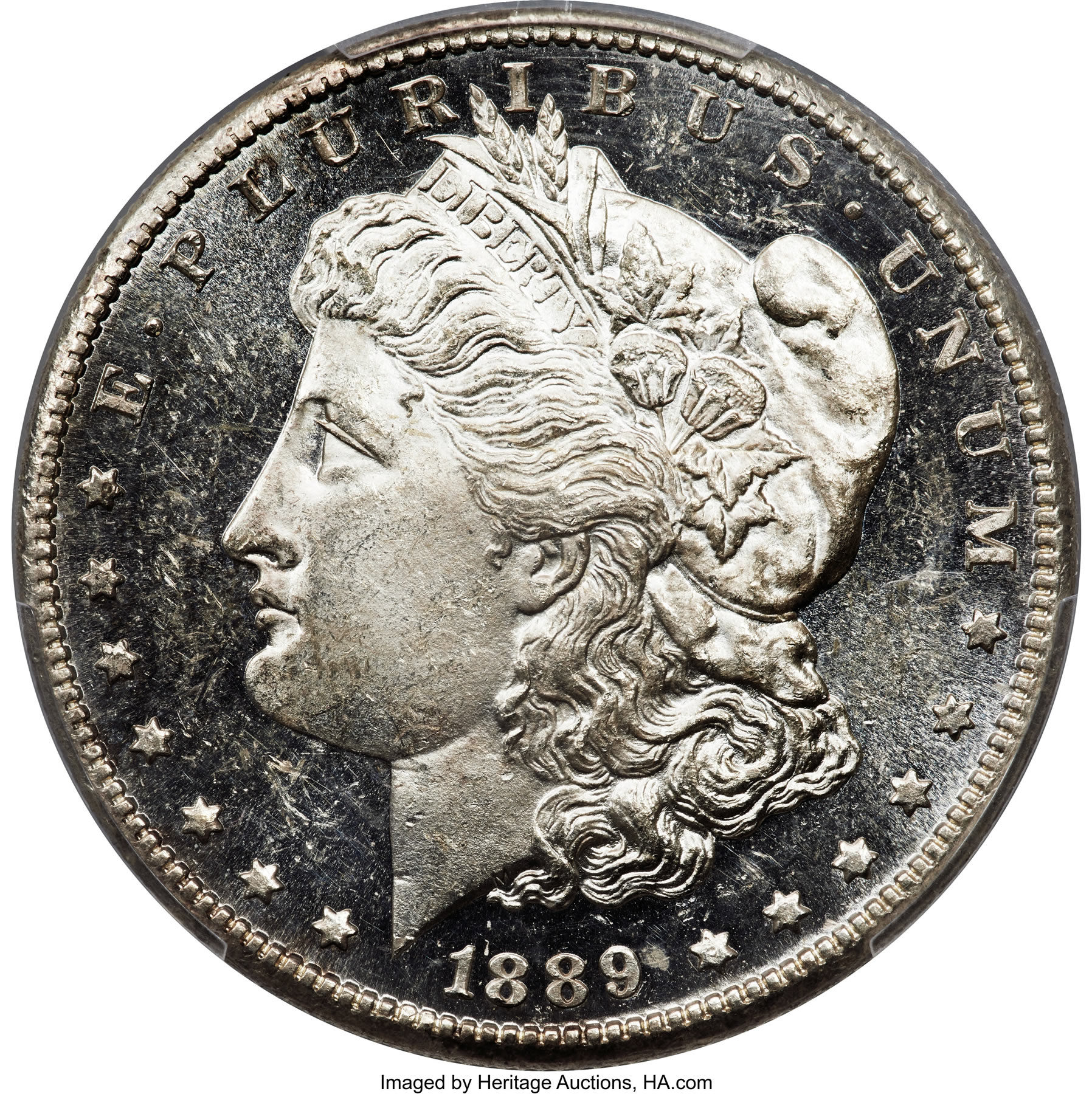 An 1889-CC Dollar MS63 Deep Mirror Prooflike PCGS. CAC is a key to the Carson City series. The 1889-CC and 1893-S silver dollars are the two business strikes that top the want lists of more collectors than any other Morgan issues, and the 1889-CC is by far the single most desirable Morgan dollar from the Carson City Mint, bolstered by a mintage that was low even by the latter-year standards of the Nevada facility – and one where many specimens wound up being melted later. One estimate from Carson City specialist Rusty Goe suggests as many as 92%, or 325,000 of the 350,000 pieces struck, may have been destroyed under terms of the 1918 Pittman Act. Less than 3% of the 1889-CC date qualify for Deep Mirror Prooflike recognition, and far fewer pieces also achieve CAC endorsement.