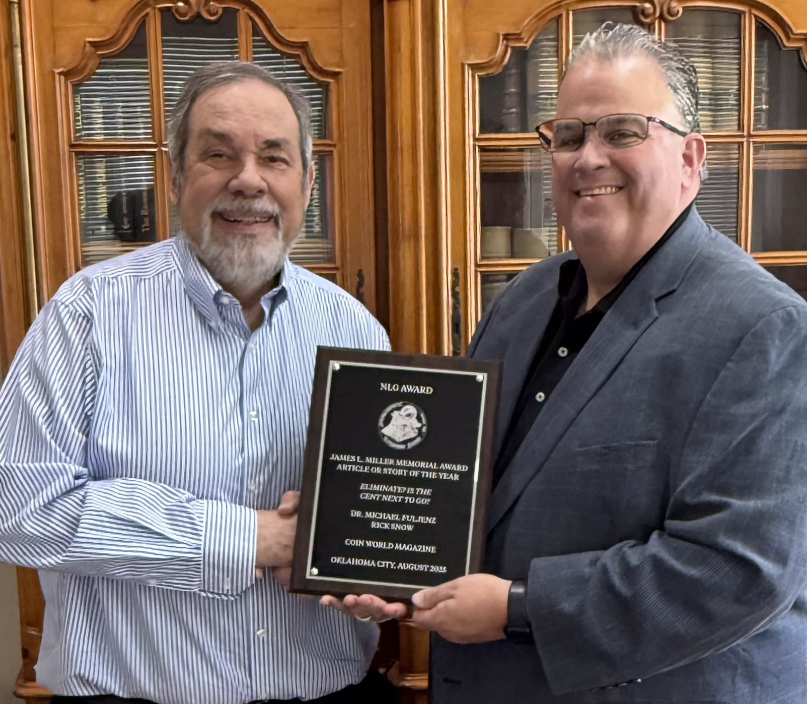 The Numismatic Literary Guild (www.NLGonline.org) presented Fuljenz with the prestigious James L. Miller Award for the best story of the year. He received the honor for his article, "Eliminate? Future of the Cent," published in January 2025 simultaneously as the cover stories in editions of Coin World and COINage magazines. The story appeared weeks before President Trump issued his executive order to halt production of U.S. one-cent denomination coins.