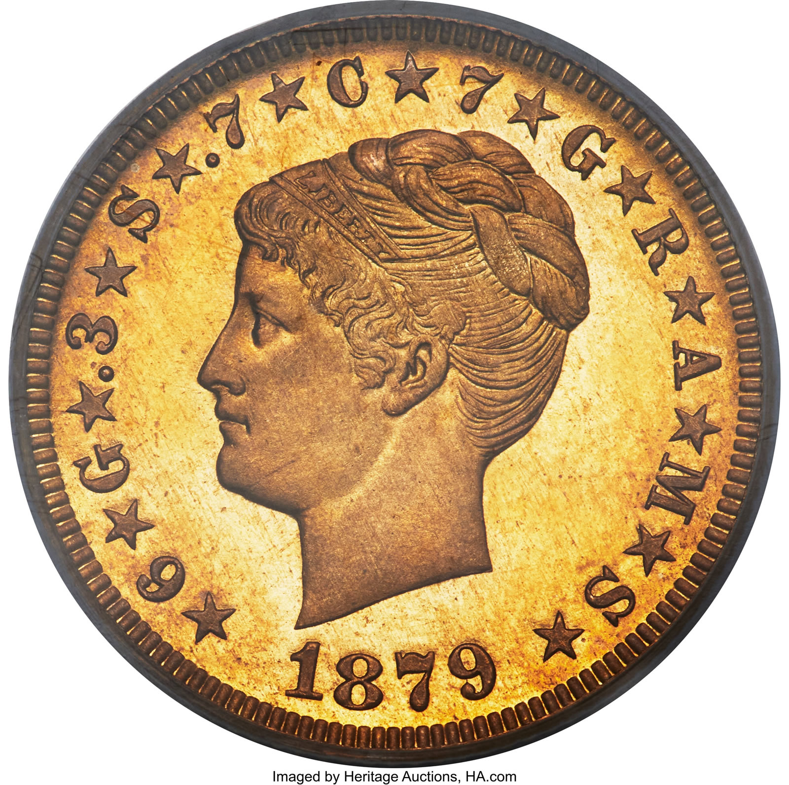 1879 Coiled Hair Stella, PR65 PCGS. CAC - An 1852 Assay Office Fifty Dollar, MS64 PCGS. CAC. K-14, R.5: $690,000, racing past the previous auction record of $411,250 that was set at Heritage in 2014