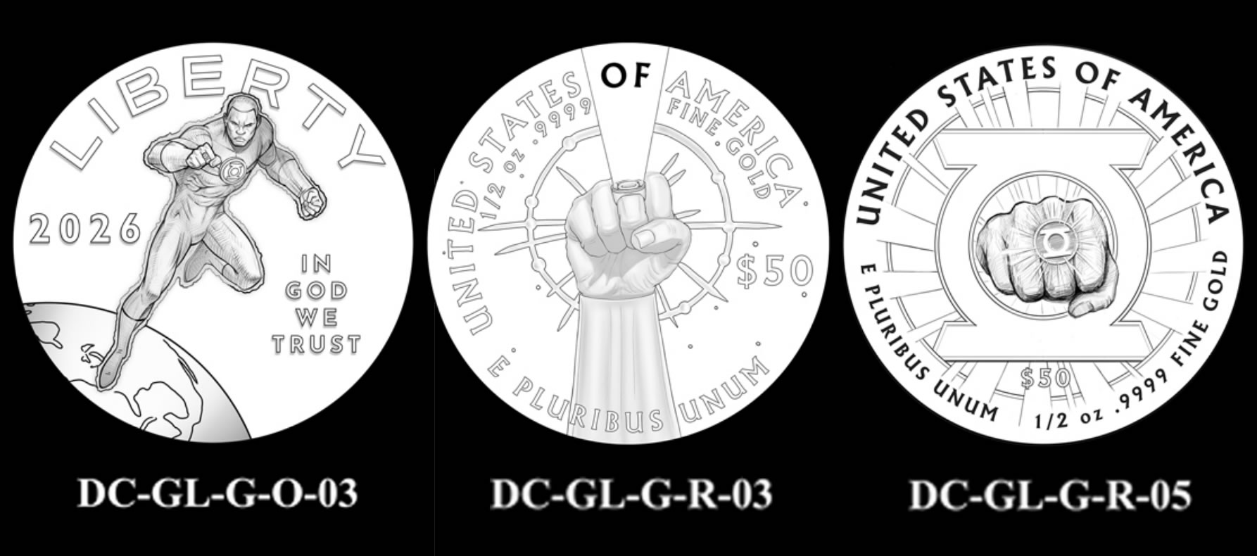 The obverse designs depict John Stewart, Earth’s third Green Lantern. Design O-03 was chosen as the overall favorite by both the CCAC and CFA, while ranking as Warner Bros. Discovery’s second preference. Their first choice was O-01.