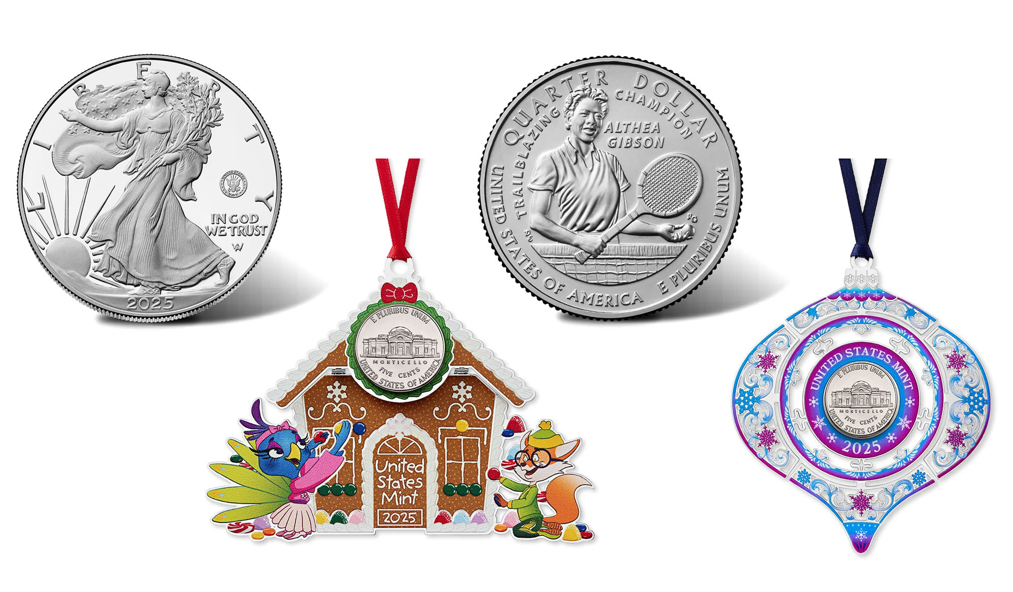 Products include the limited-edition 250th Anniversary U.S. Navy 2025-W Proof American Silver Eagle, rolls and bags of the Althea Gibson quarter, and two Christmas-themed ornaments — with the latter two serving as the Mint’s final entries in their respective lines. The quarter closes out the four-year, 20-coin American Women quarter dollar series, which celebrates the accomplishments and contributions of notable women.
