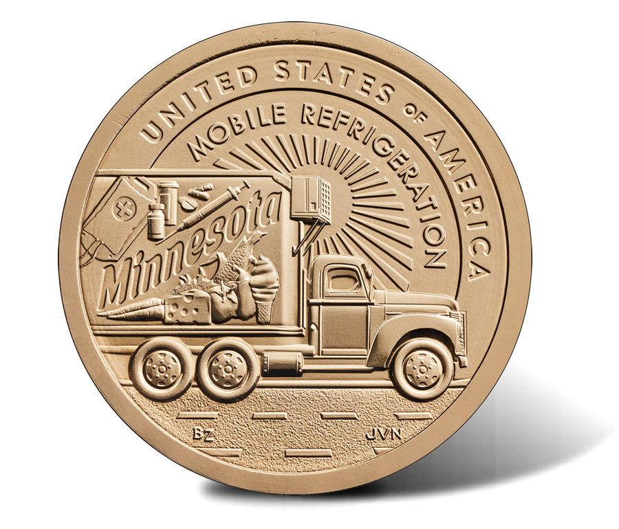 This design features a 1940s-era truck with an early front-mounted refrigeration unit. The icons adorning the side of the truck identify the diverse temperature-sensitive goods whose widespread transportation was made possible by this innovation. Inscriptions are "UNITED STATES OF AMERICA" and "MINNESOTA." The additional inscription is "MOBILE REFRIGERATION."