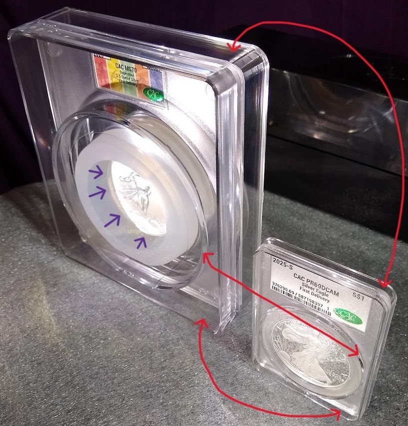 Here’s the old oversized PCGS w/puck holder vs the new CACG w/Sup holder. The puck is twice as big as Sup, but Supe’s holder is 3x thicker than the PCGS holder. CACG blew a gasket!