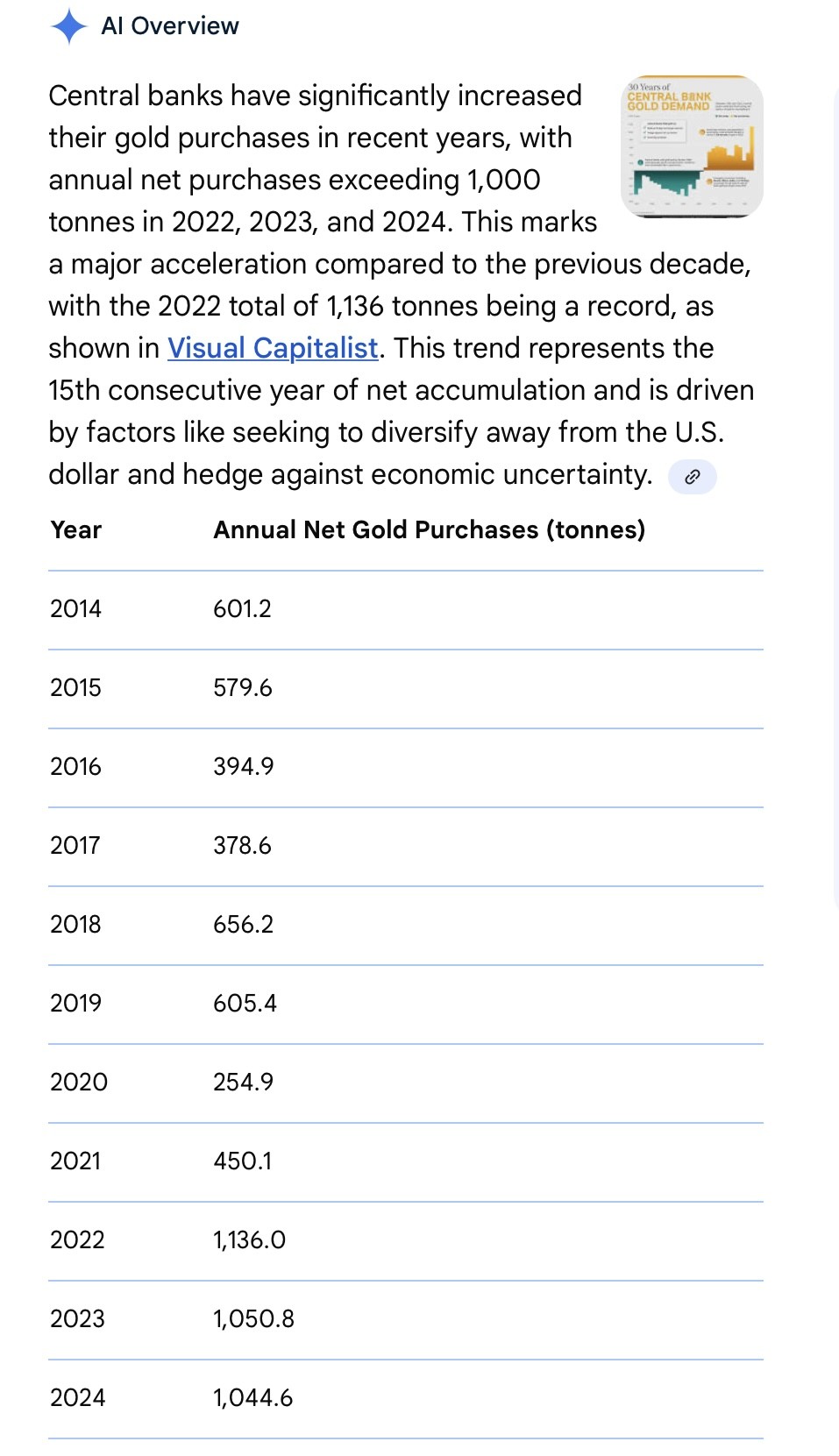 Asking Google about Central Bank purchases of gold bullion last 10 years, this chart was provided in response to my inquiry. No way to tell how much was new production vs sales from existing supply, but Central bank purchases exceed 1000 tons per year…..point is no way to prove ETFs actually possess, or for that matter to prove how much any entity actually possesses….One can “hope” I guess….