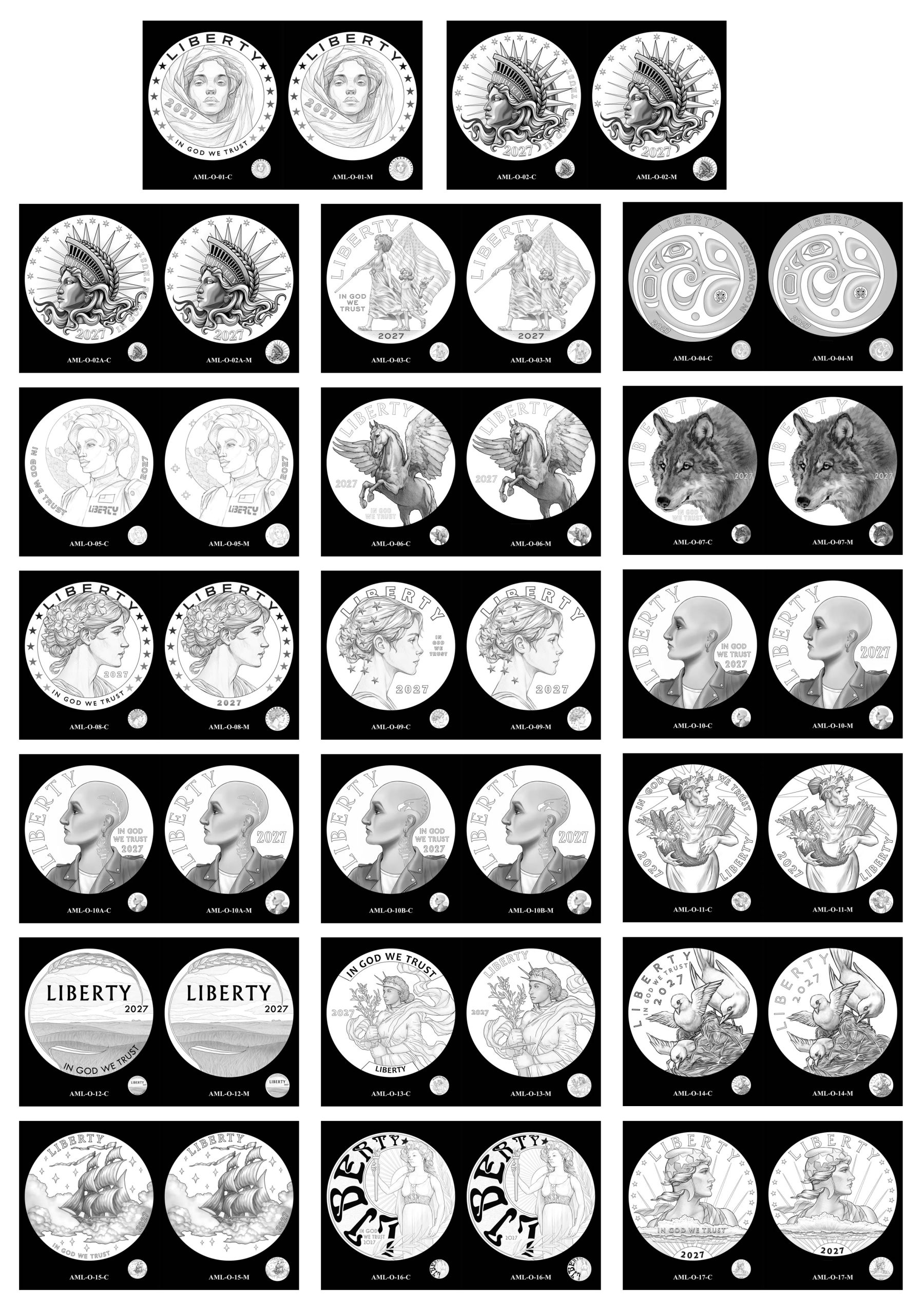The United States Mint has revealed a range of design candidates for the 2027 American Liberty Gold Coin and Silver Medal, showcasing 20 potential obverses and 12 reverses. The portfolio of line art renderings was presented Oct. 21 to the Citizens Coinage Advisory Committee (CCAC), an 11-member federal body that advises the Treasury Secretary on coin and medal themes and designs.