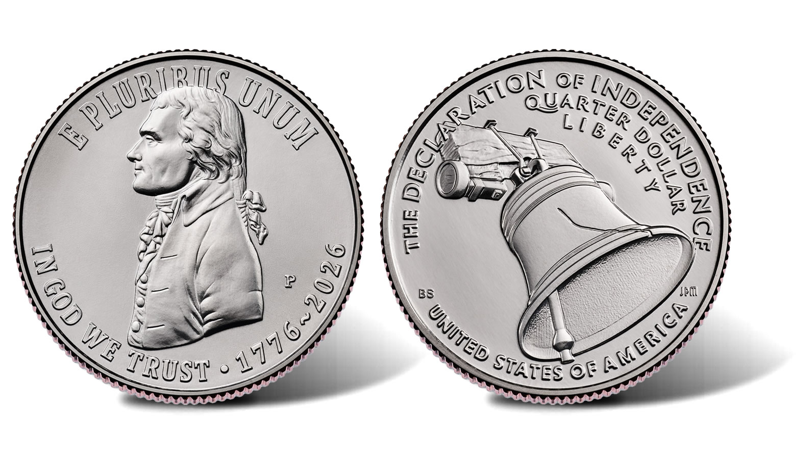 The reverse design depicts the Liberty Bell ringing. While it is unclear whether it rang out in July 1776, the Liberty Bell often rang to draw people near and share an announcement, or a declaration. The Bell’s crack is visible; the fragility of the Bell echoing the fragility of a young nation at its founding. The inscriptions are "THE DECLARATION OF INDEPENDENCE," "QUARTER DOLLAR," "LIBERTY," and "UNITED STATES OF AMERICA."