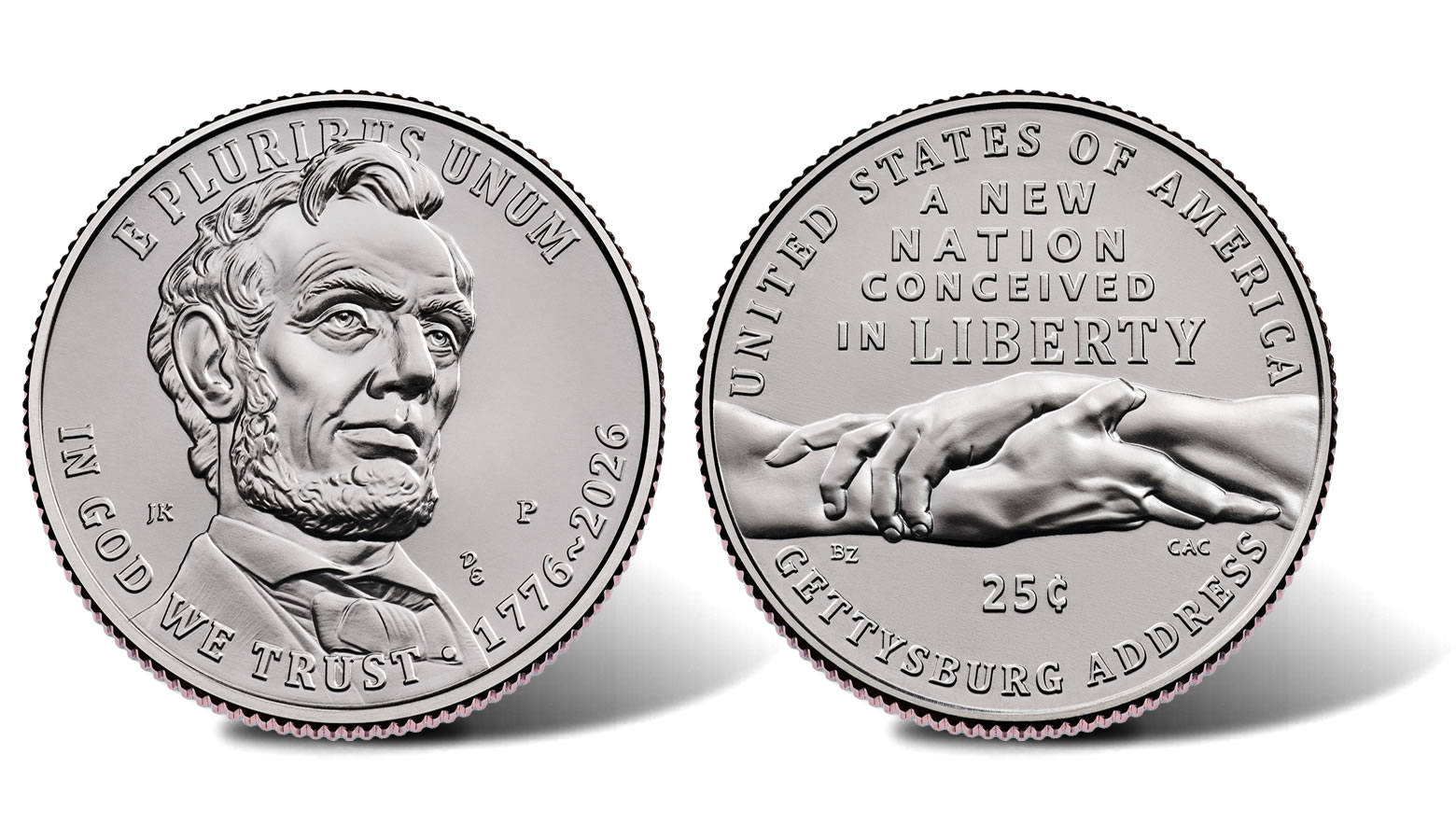 The reverse design features the inscription "A NEW NATION CONCEIVED IN LIBERTY," a passage from President Abraham Lincoln’s Gettysburg Address. Two hands grasping each other represent Lincoln’s efforts to hold the Nation together and his appeal to Americans to honor the dead and ensure "that government of the people, by the people, for the people, shall not perish from the earth." The inscriptions are "UNITED STATES OF AMERICA", "A NEW NATION CONCEIVED IN LIBERTY," "25¢," and "GETTYSBURG ADDRESS."
